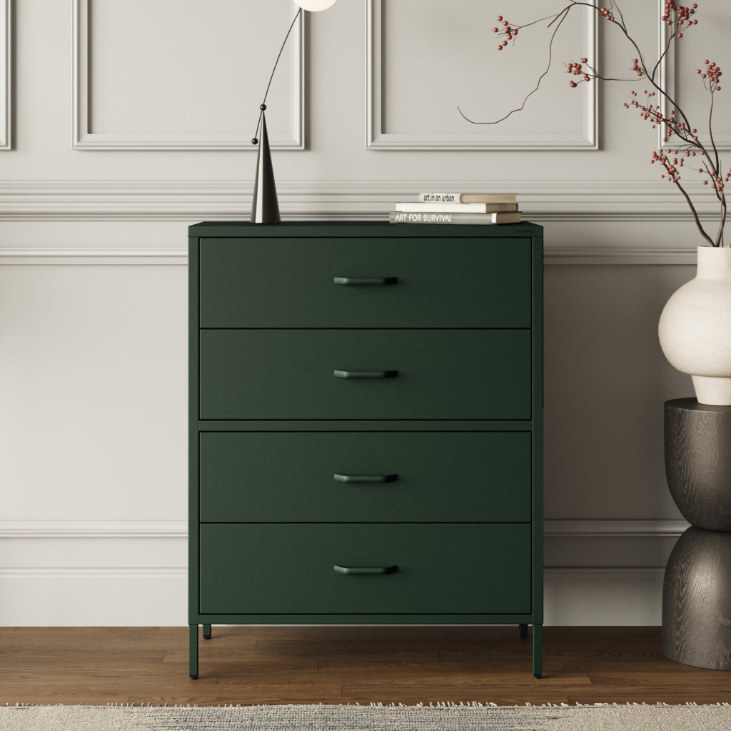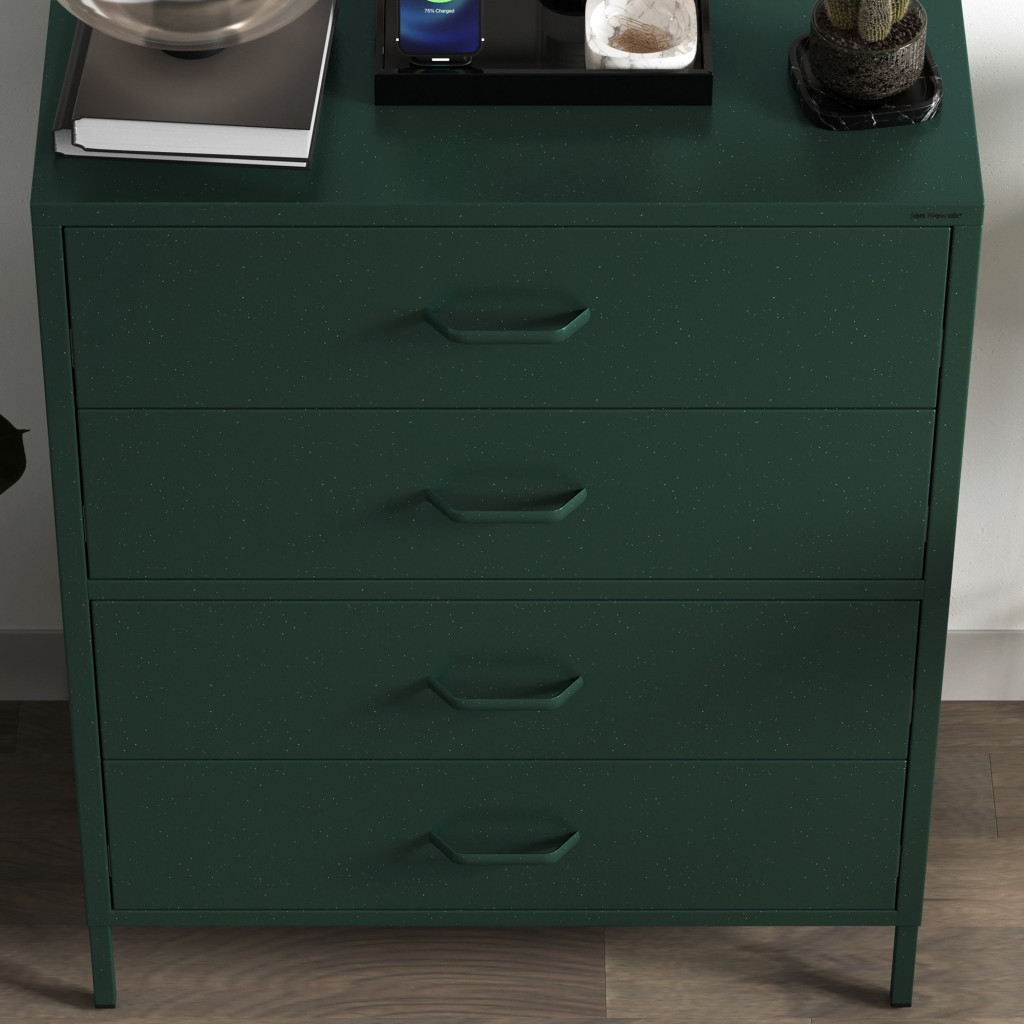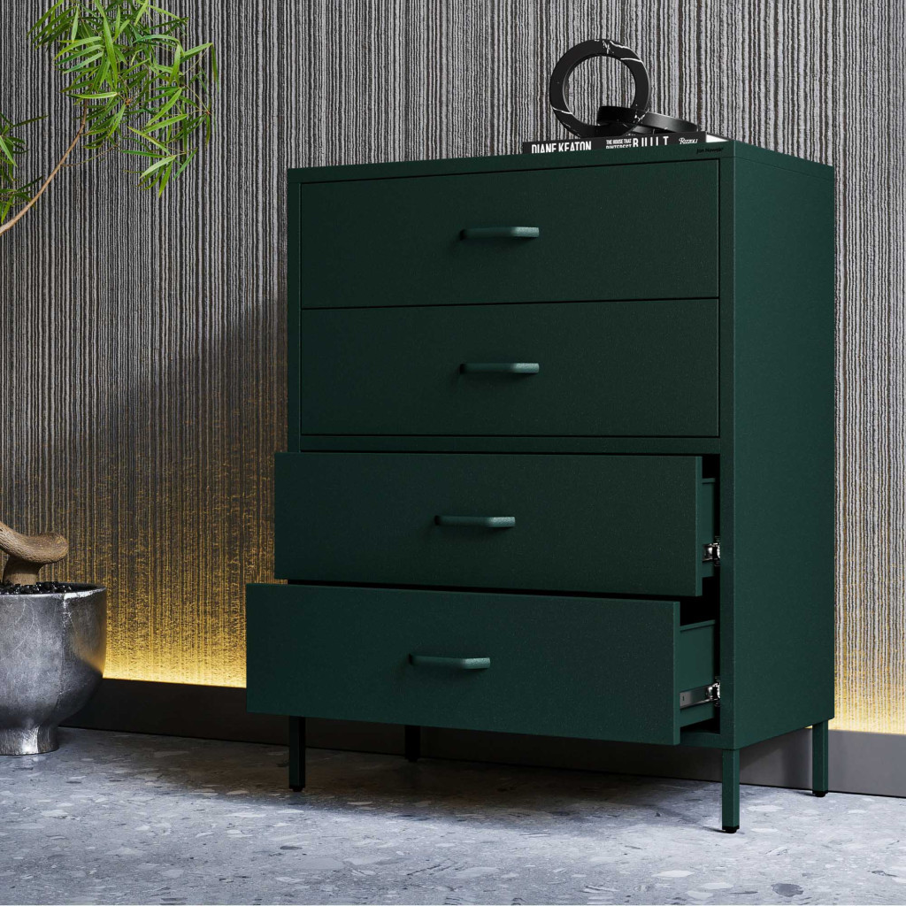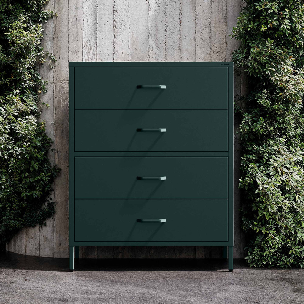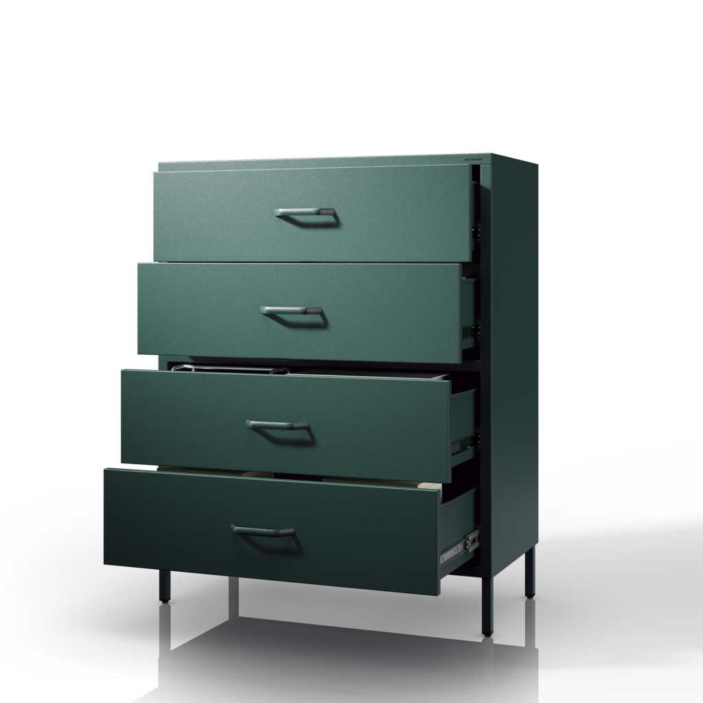 A komód váza 0,6 mm vastag acélból készült, így kimagasló stabilitást és hosszú élettartamot biztosít. Négy tágas fiókja masszív, gördülékenyen futó fém síneken mozog, amelyek akár 45 kg terhelést is biztonságosan megtartanak fiókonként. Ez lehetővé teszi, hogy ne csak ruhákat vagy kisebb tárgyakat, hanem nagyobb tömegű dokumentumokat, elektronikai eszközöket vagy dekorációs elemeket is magabiztosan tárolj benne.