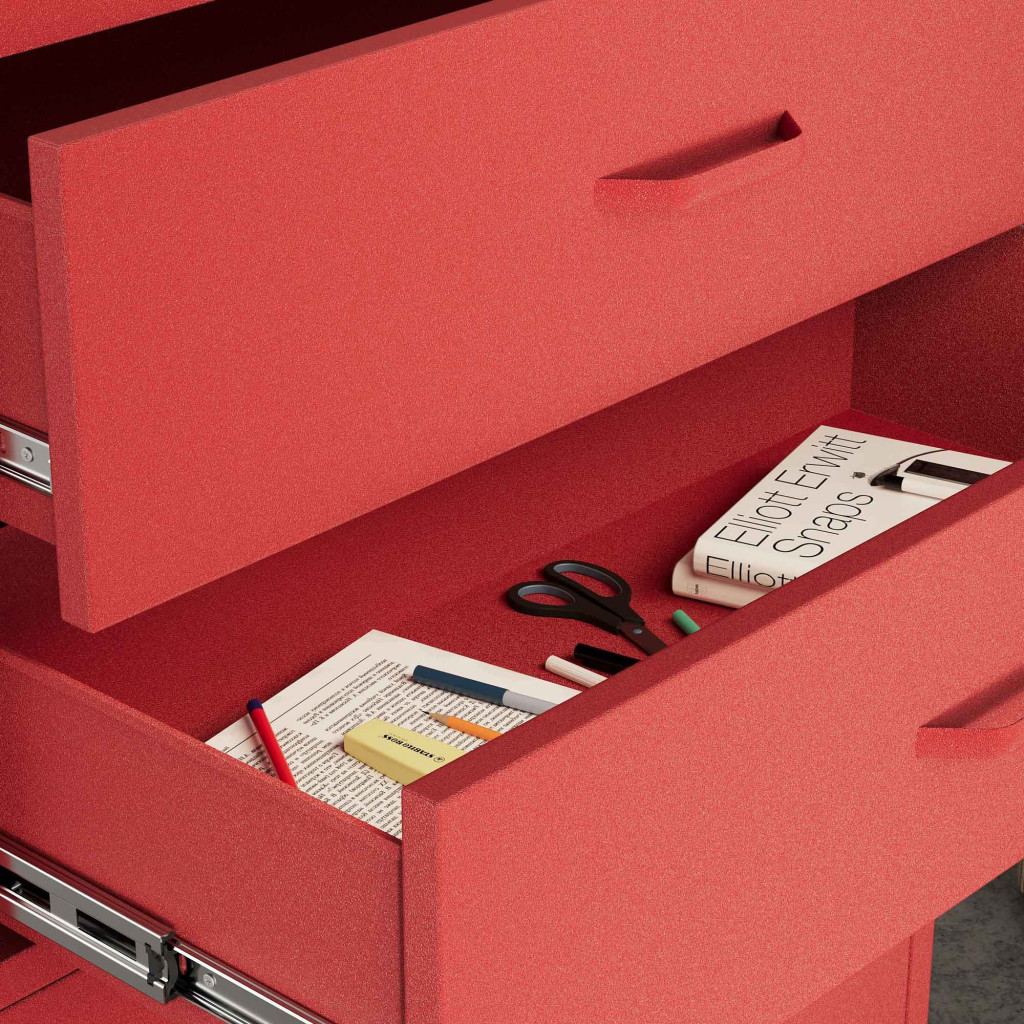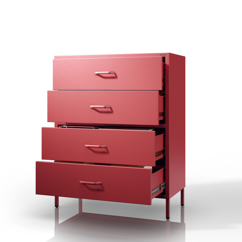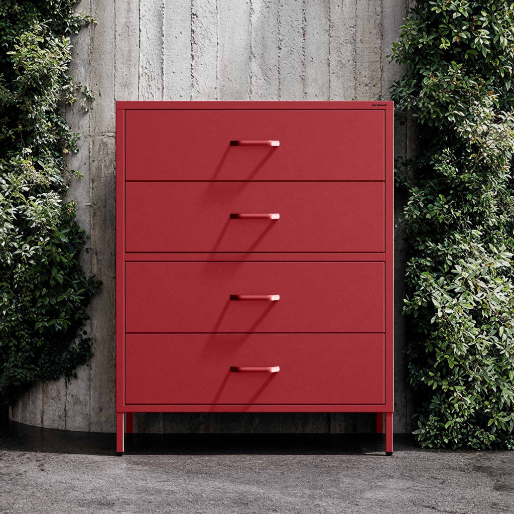 A CARLA 1582 piros fém komód az a bútordarab, amely egy szobát egyetlen mozdulattal karakteressé tesz. A modern, elegáns fémvázat élénk, mélypiros Sparkling Brilliance™ bevonat emeli ki, amely finoman csillogó szemcséivel fényben életre kel, így a komód már első pillantásra látványos design-elemmé válik. Formavilága minimalista, mégis ikonikus; tökéletes nappaliba, hálószobába vagy akár egy modern dolgozószobába, ahol a stílus és a funkcionalitás együtt számít.