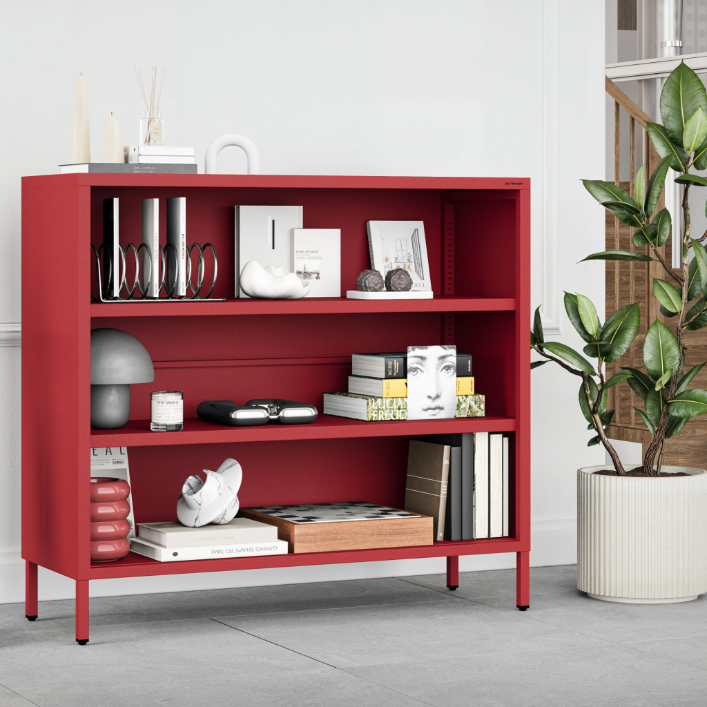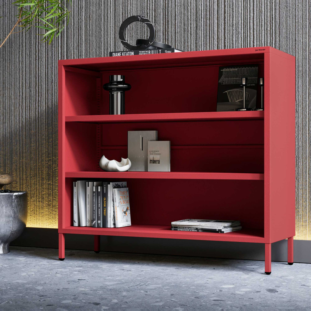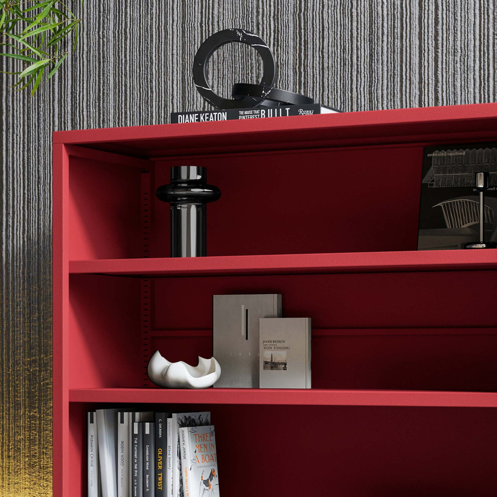 A bútor mérete 1000 × 900 × 350 mm, tehát szélessége 1000 mm, magassága 900 mm, mélysége 350 mm — ideális választás olyan helyekre, ahol a kompakt tárolás határozott jelenléttel párosul. A belső tér két állítható fém polcot rejt, amelyeket 25 mm-es lépésekben lehet áthelyezni. A polcok akár 40 kg teherbírásúak, így bőven elbírják a könyveket, dekorációkat, dossziékat, növényeket vagy nagyobb albumokat is. A fém konzolok és a felső stabilizáló elemek gondoskodnak róla, hogy a polcok minden beállítás mellett stabilan maradjanak.