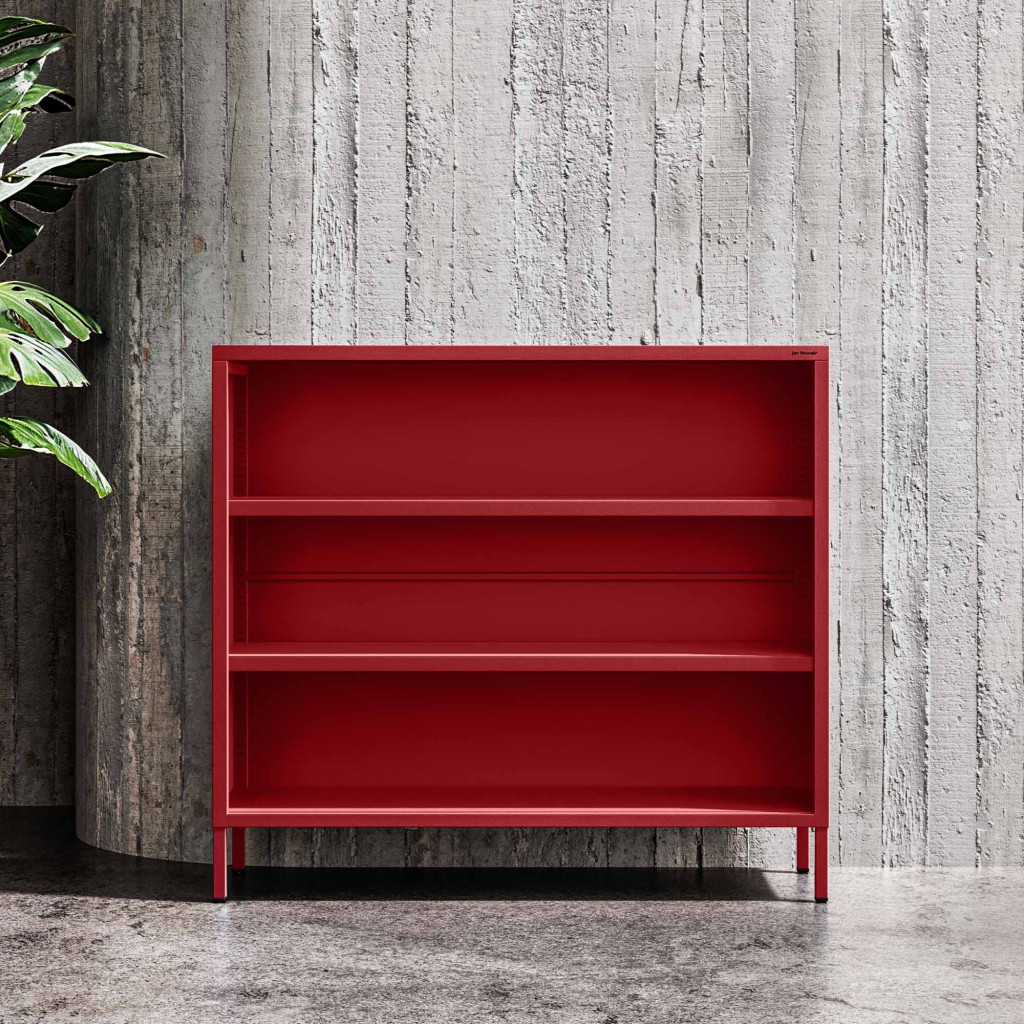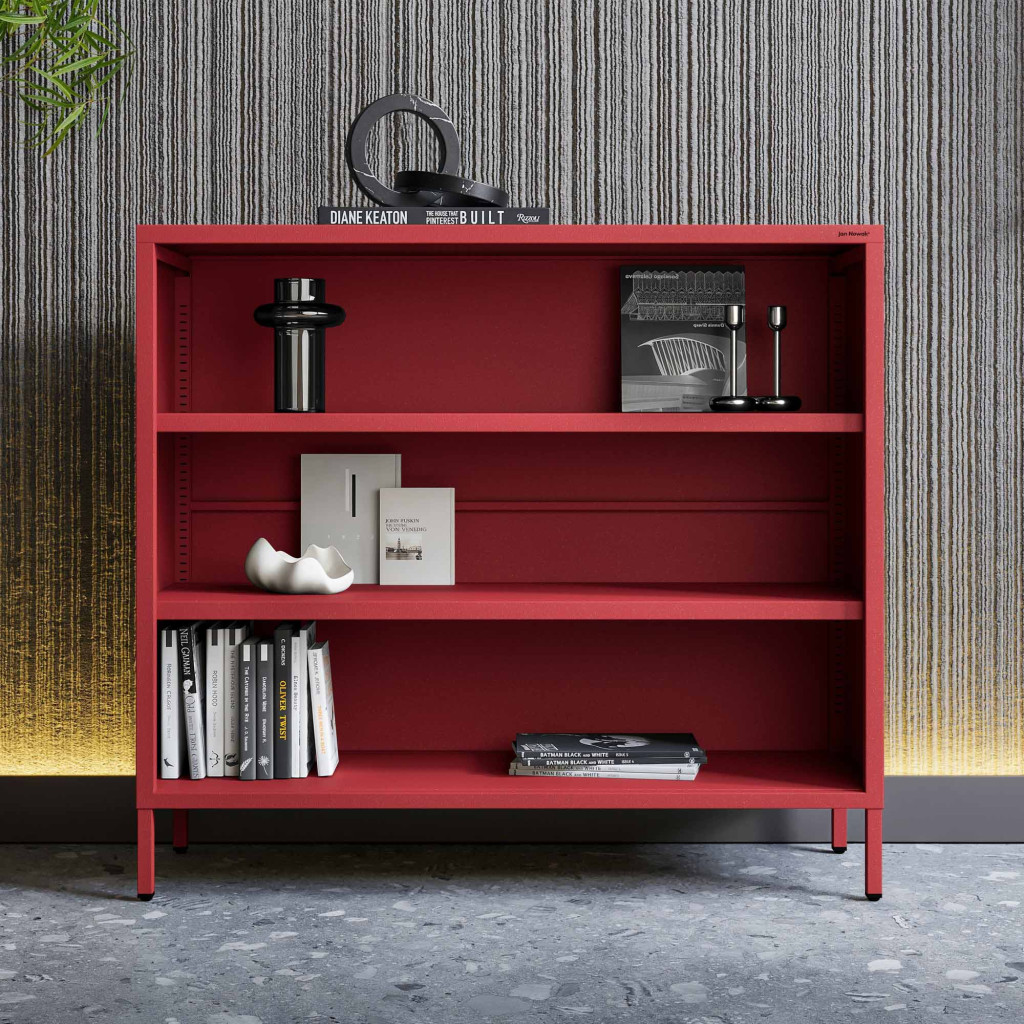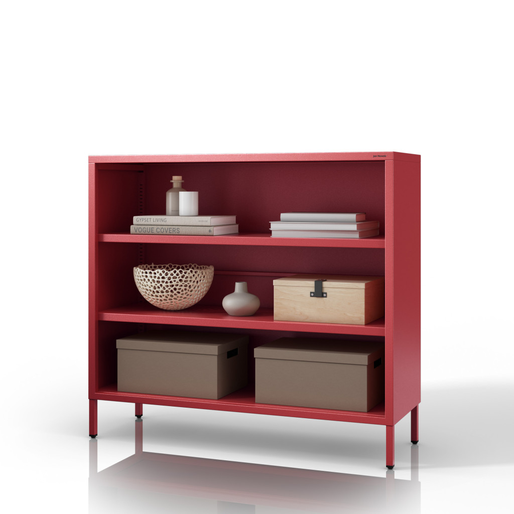 A bútor mérete 1000 × 900 × 350 mm, tehát szélessége 1000 mm, magassága 900 mm, mélysége 350 mm — ideális választás olyan helyekre, ahol a kompakt tárolás határozott jelenléttel párosul. A belső tér két állítható fém polcot rejt, amelyeket 25 mm-es lépésekben lehet áthelyezni. A polcok akár 40 kg teherbírásúak, így bőven elbírják a könyveket, dekorációkat, dossziékat, növényeket vagy nagyobb albumokat is. A fém konzolok és a felső stabilizáló elemek gondoskodnak róla, hogy a polcok minden beállítás mellett stabilan maradjanak.