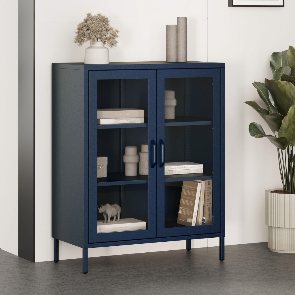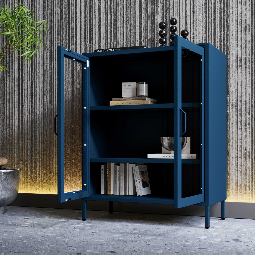 A GINA 1589 sötétkék alacsony vitrin olyan bútordarab, amely egyetlen mozdulattal képes átalakítani egy helyiség hangulatát. A mély, karakteres kék árnyalat eleganciát és vizuális mélységet visz a térbe, miközben kompakt méreteinek köszönhetően a kisebb nappalikban, dolgozószobákban vagy igényes irodákban is könnyedén elfér. A bútor váza teljes egészében 0,6 mm vastag fémből épül fel, így nem csak látványában kifinomult, hanem rendkívül stabil és tartós is.