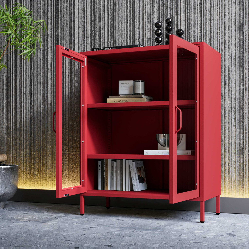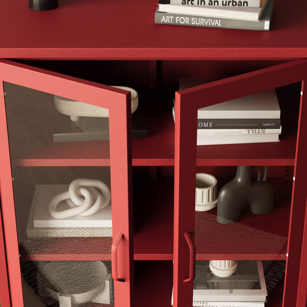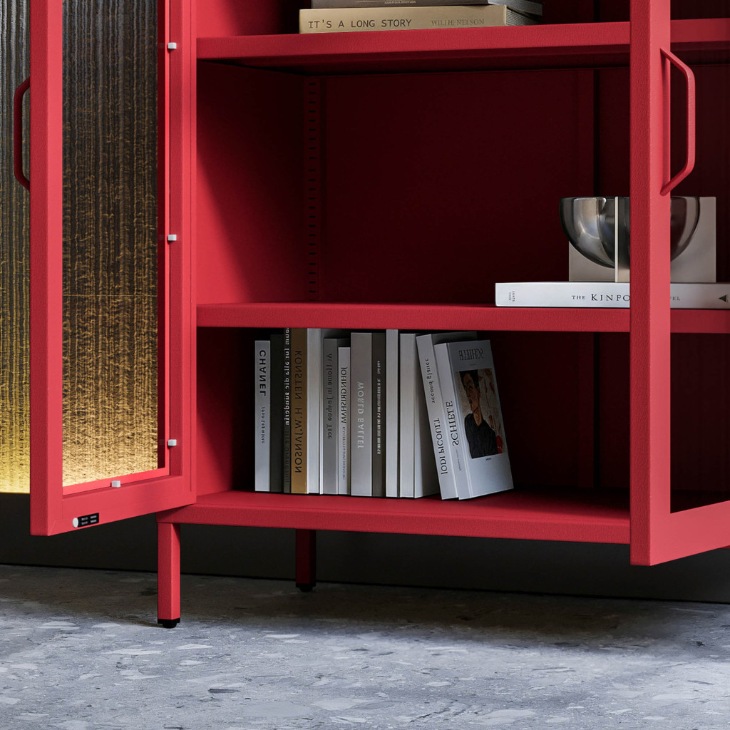 Az előlapot kialakító edzett üvegajtók minden elhelyezett tárgyat kiemelnek, miközben teljes védelmet nyújtanak a por és a sérülések ellen. A mágneses zár tökéletes illeszkedést biztosít, a szilikon ütközők pedig jelentősen csökkentik a záródási zajt — ez teszi a GINA 1595-öt ideálissá olyan helyiségekben is, ahol a csend fontos szempont. A porfestett acél könnyen tisztítható, és évek múltán is megőrzi a piros árnyalat friss, dinamikus fényét.