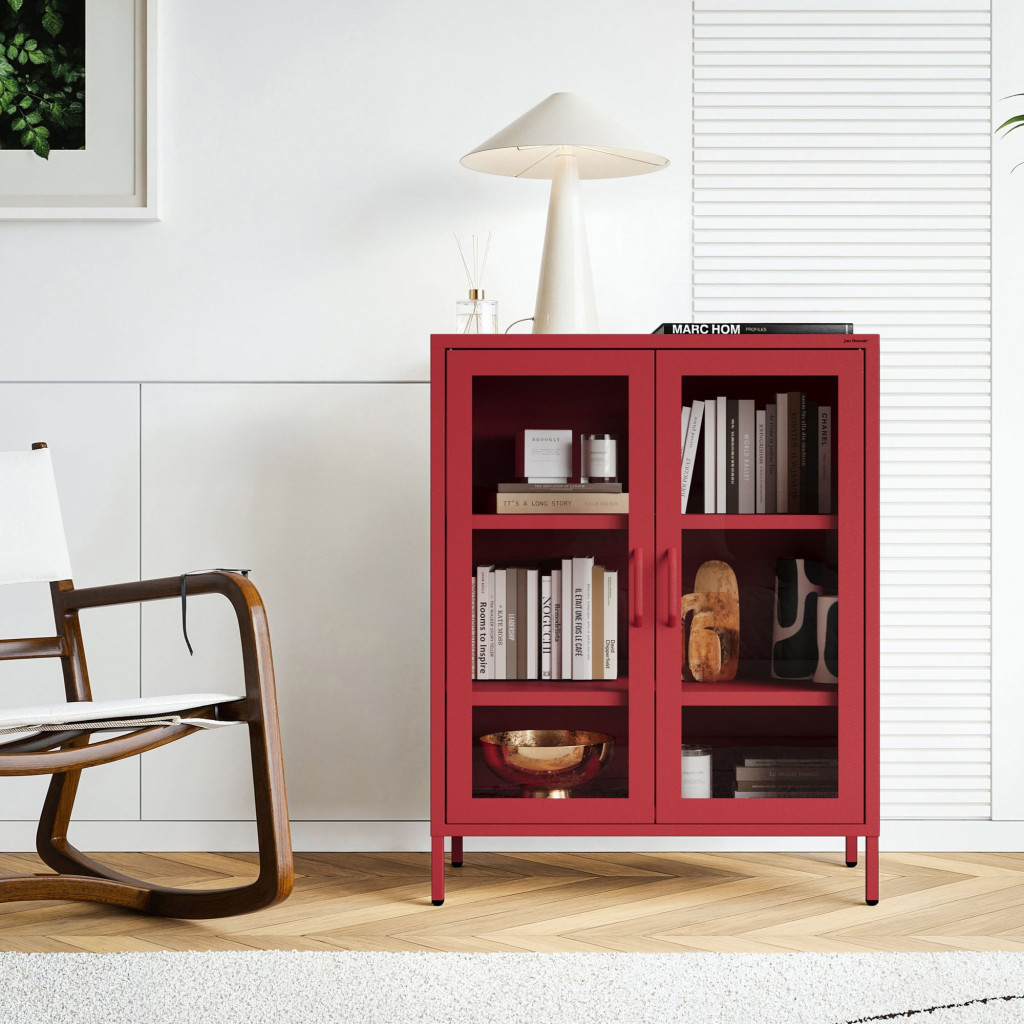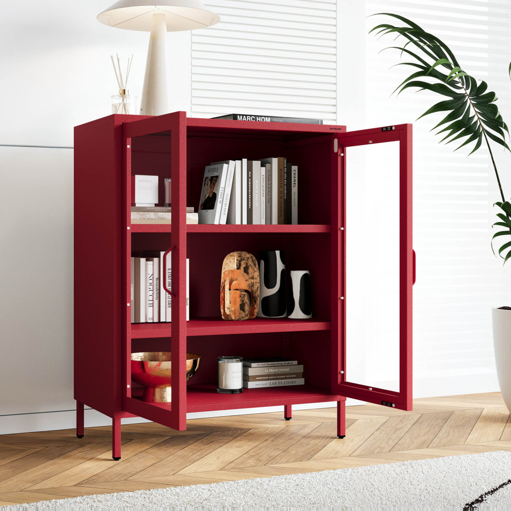 A GINA 1595 piros alacsony vitrin azoknak készült, akik szeretik, ha egy bútor egyszerre vibráló és kifinomult. A lendületes piros árnyalat azonnal energiát visz a térbe, mégis elegáns marad a karcsú vonalvezetésnek és a harmonikus arányoknak köszönhetően. A vitrin váza kizárólag 0,6 mm vastag fémelemből épül, így stabil, tartós és mindennapi használatra is ideális — legyen helye nappaliban, irodában vagy egy modern előtérben.