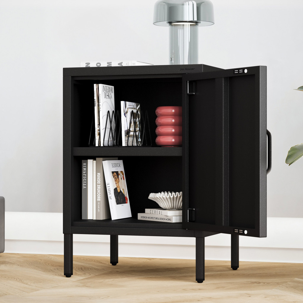 A szekrény masszív fém szerkezete garantálja a tartósságot és a stabilitást. Ez a kiváló minőségű anyag biztosítja, hogy a bútordarab ellenálljon a mindennapi használatnak, miközben megőrzi elegáns megjelenését.