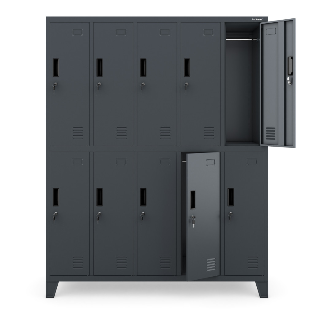 A BARTEK 1879 fém öltözőszekrény masszív fém szerkezete hosszú élettartamot és megbízható használatot garantál. A 10 különálló, zárható ajtó elegendő tárolóhelyet biztosít a személyes tárgyaknak, miközben a szekrény kompakt mérete miatt kis helyiségekben is elhelyezhető.