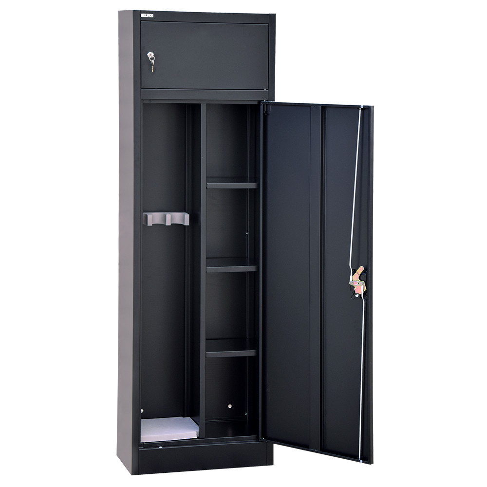 A szekrény 0,6 mm vastag acéllemez testtel és ajtóval készül, fekete, RAL 9005 színű, műanyag porszórt felülettel. Ez az alap kategóriában megszokott kialakítás, amely a mindennapi használathoz megfelelő megoldást kínál. Az ajtó 110 fokban nyitható, megerősített kivitelű, a zárás pedig többirányú acélrudakkal történik. A szekrény kulcsos biztonsági zárral rendelkezik, amelyhez 2 darab kulcs tartozik.