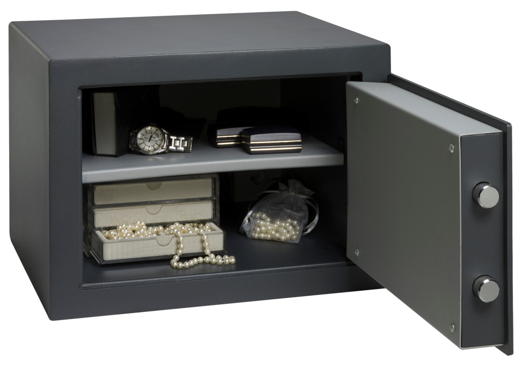 A belső tér egy darab kivehető acélpolccal van felszerelve, amely megkönnyíti a tartalom rendszerezését, így külön tárolhatók a készpénz, ékszerek, iratok vagy adathordozók. A 28 literes kapacitás elegendő helyet kínál mindennapi értéktárgyak biztonságos elhelyezésére, miközben a kompakt méret lehetővé teszi a diszkrét elhelyezést szekrényben, íróasztal alatt vagy falra rögzítve.