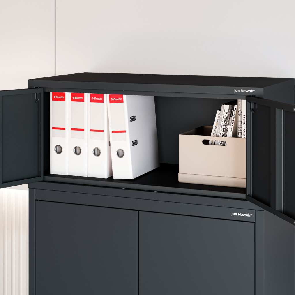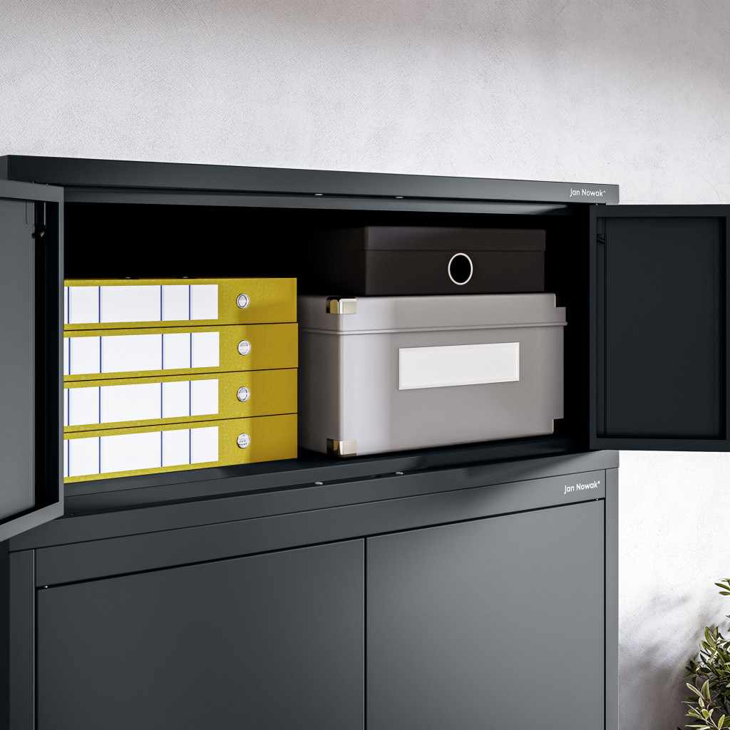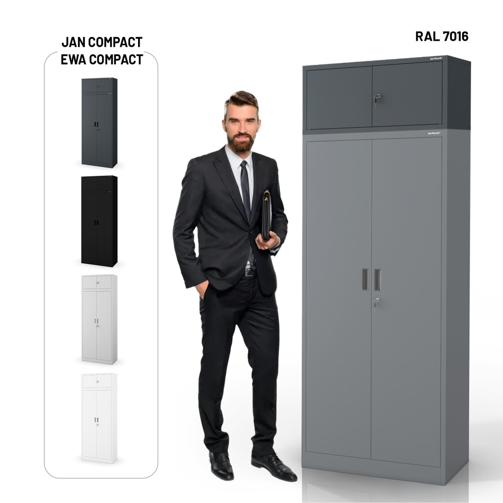 Az EWA Cabinet Compact antracit színben (RAL7016) ötvözi az esztétikát és a funkcionalitást. A helytakarékos méretek – 380 mm magas, 800 mm széles, 400 mm mély – lehetővé teszik a szekrény könnyű elhelyezését különböző helyiségekben, legyen az iroda, nappali vagy hálószoba.
