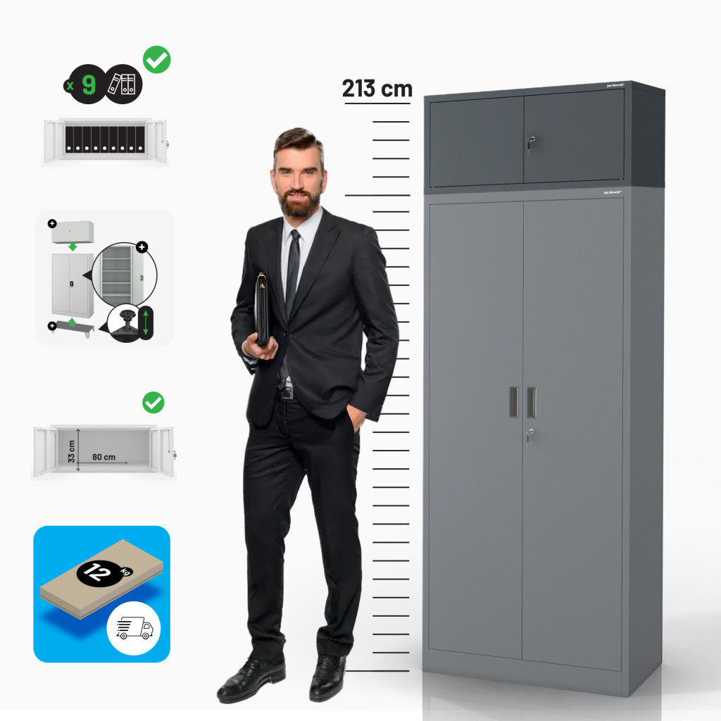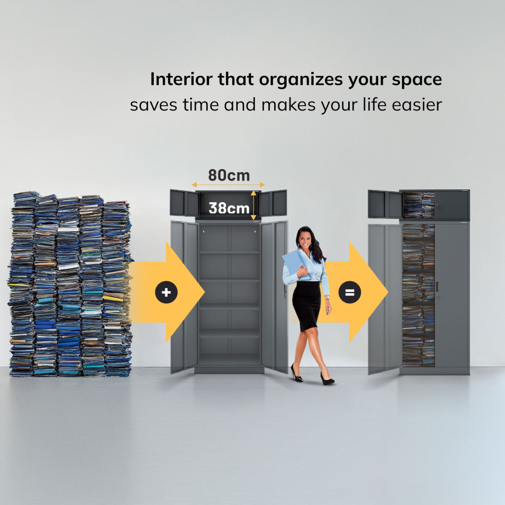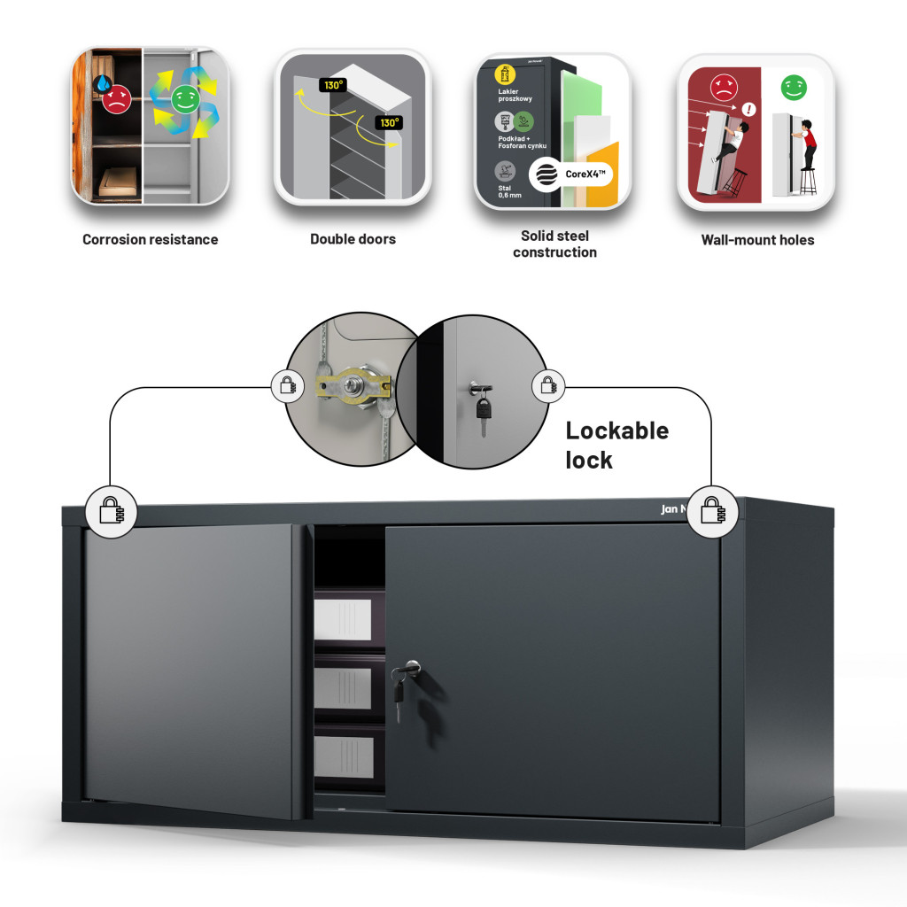 Az EWA Cabinet Compact antracit színben (RAL7016) ötvözi az esztétikát és a funkcionalitást. A helytakarékos méretek – 380 mm magas, 800 mm széles, 400 mm mély – lehetővé teszik a szekrény könnyű elhelyezését különböző helyiségekben, legyen az iroda, nappali vagy hálószoba.