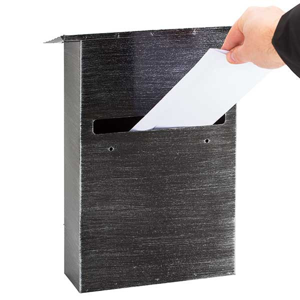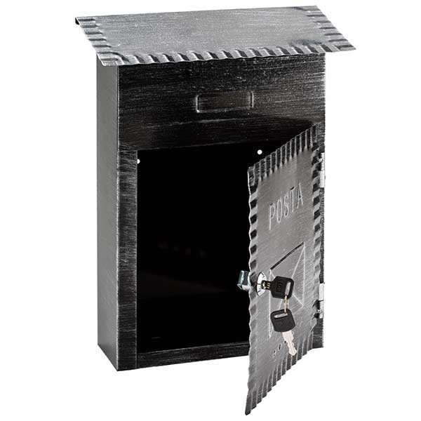 • kapun, kerítésen belülre szerelhető• anyaga kezeletlen acéllemez• műanyag porszórással színezett• hátsó bedobónyílás esővédő nélkül• felfelé nyíló ajtó• betekintő nyílással• cilinderzár nélkül