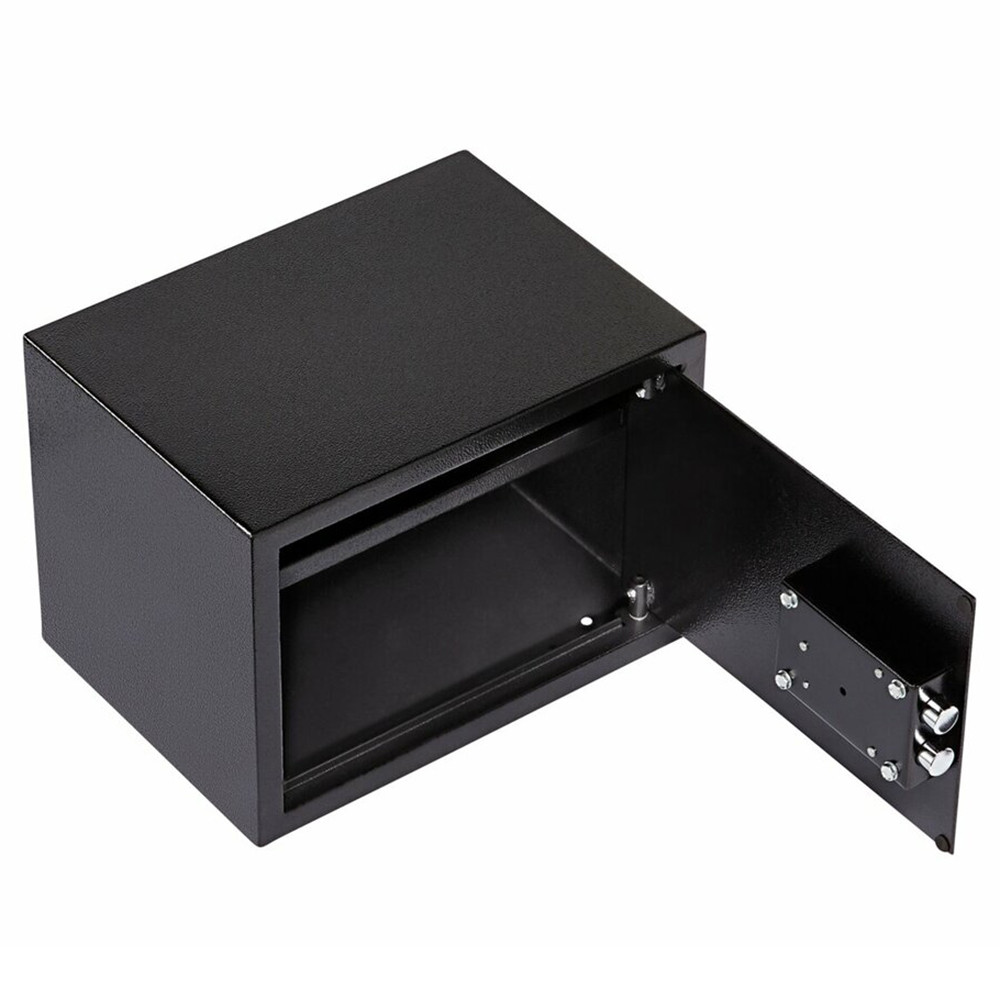 - Fekete Szín, Rögzítő Csavarokkal: A széf elegáns fekete kivitelben érkezik, rögzítő csavarokkal együtt, amelyekkel könnyedén telepíthető.