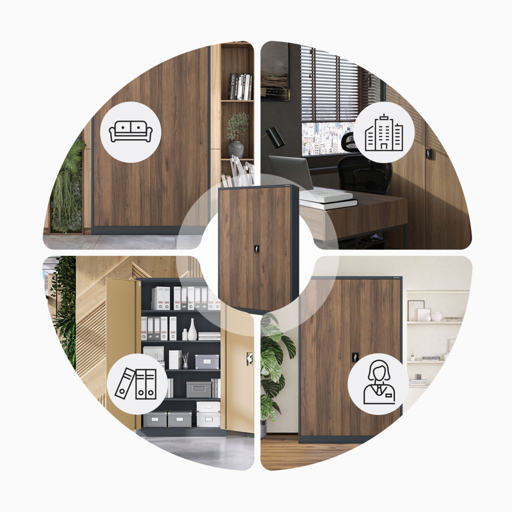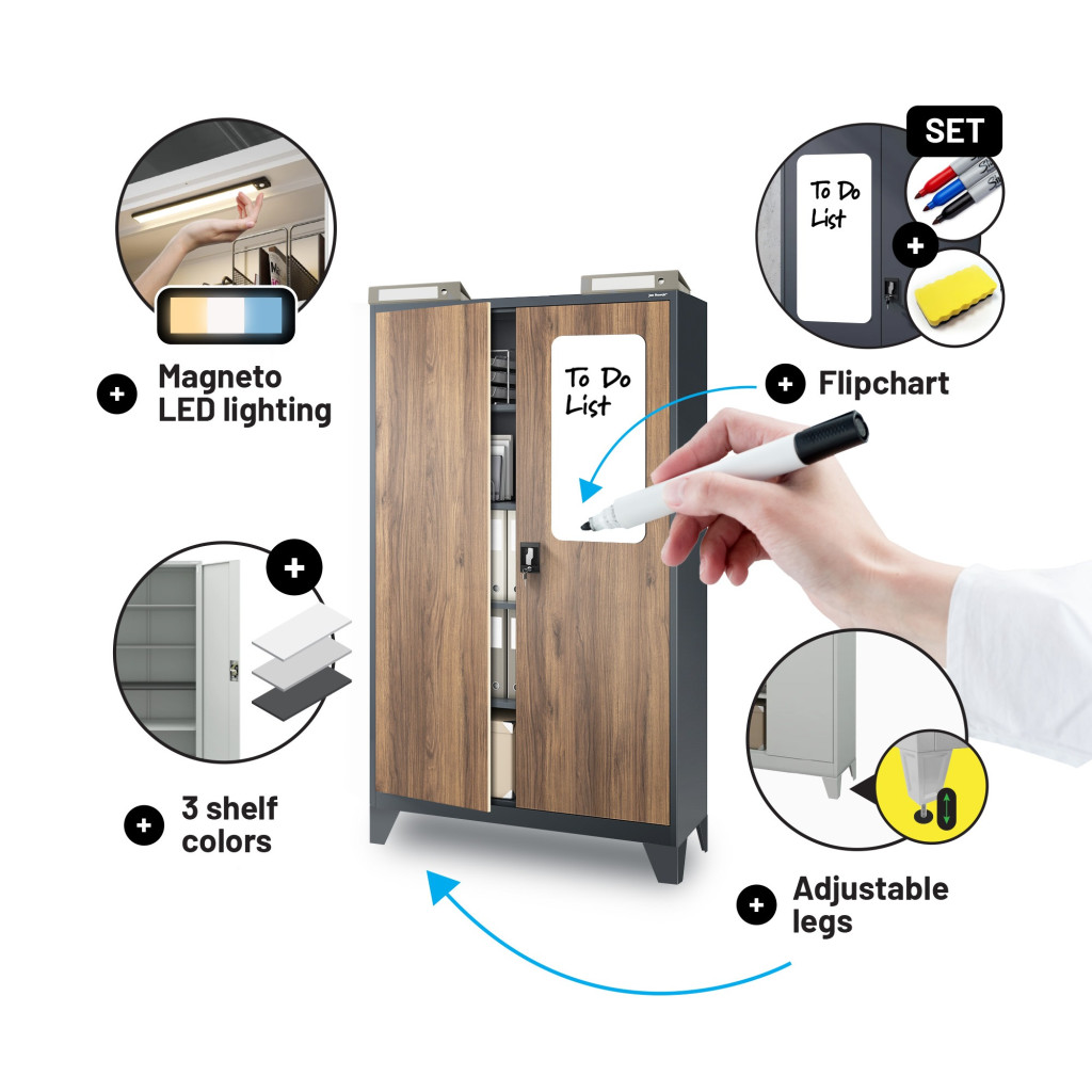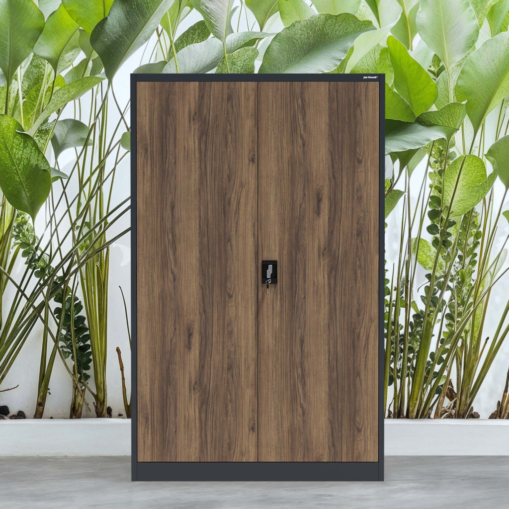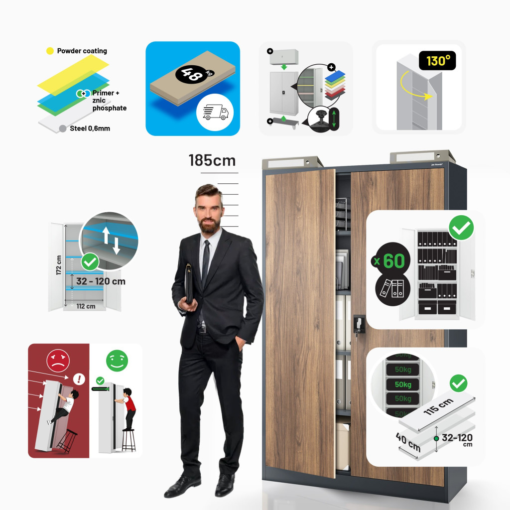A modern megjelenést az antracit szín RAL 7016 és a dió fa hatású felület kombinációja biztosítja amely elegáns és professzionális összhatást teremt bármilyen munkakörnyezetben A szekrény összeszerelést igényel de a kialakítása gyors és egyértelmű szerelést tesz lehetővé