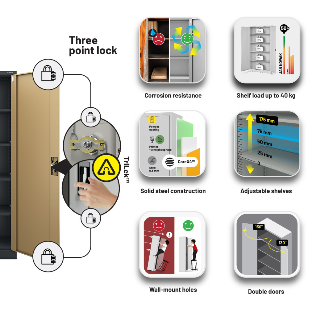 A szekrény porfestett vastag acél szerkezettel készül amely hosszú távon is stabil és ellenálló megoldást biztosít minden polc maximális terhelhetősége 50 kg így a nehéz dossziék és iratgyűjtők is biztonságosan tárolhatók A belső tér négy darab állítható polccal és egy alsó rekesszel van kialakítva ahol a polcok 25 mm-es lépésekben állíthatók az optimális helykihasználás érdekében