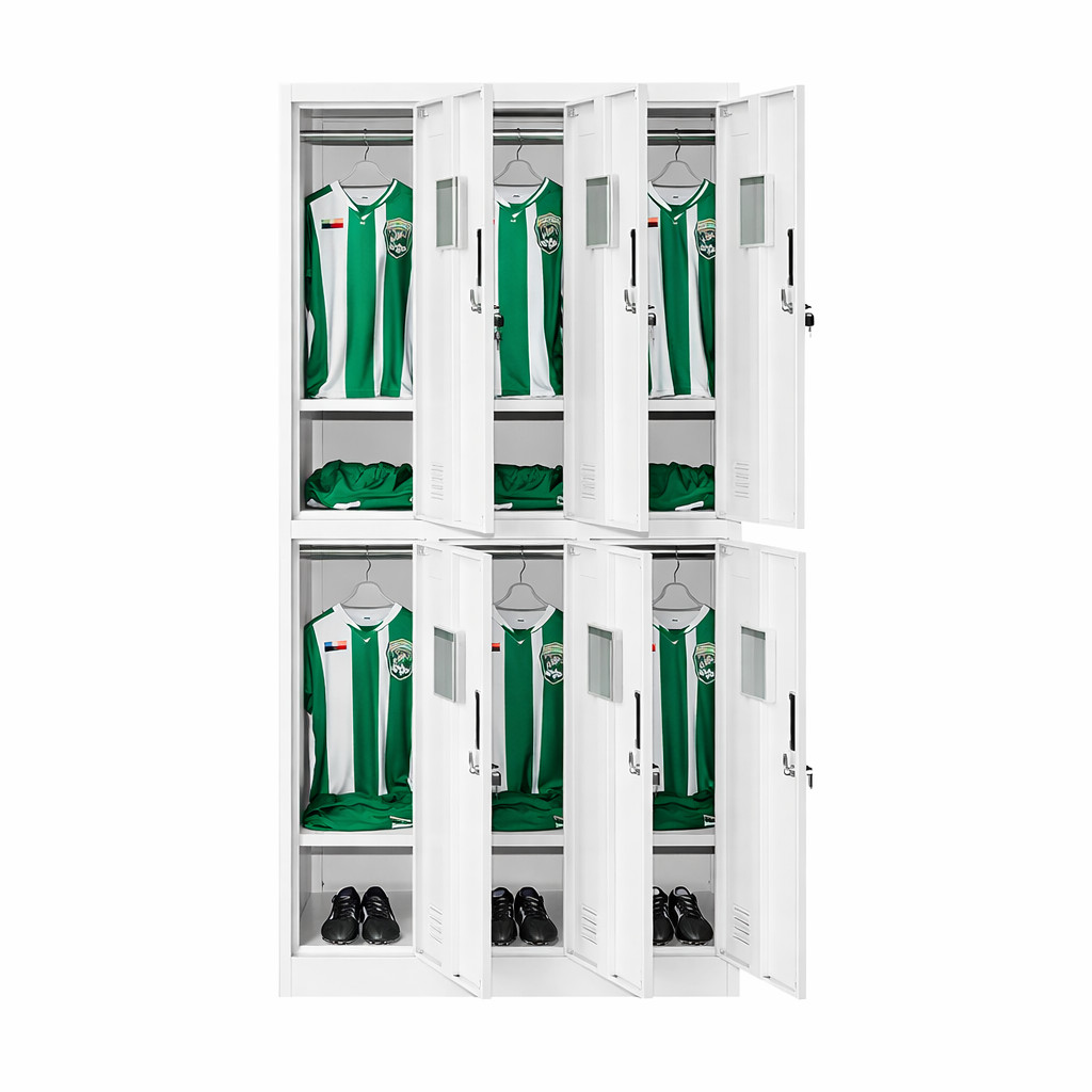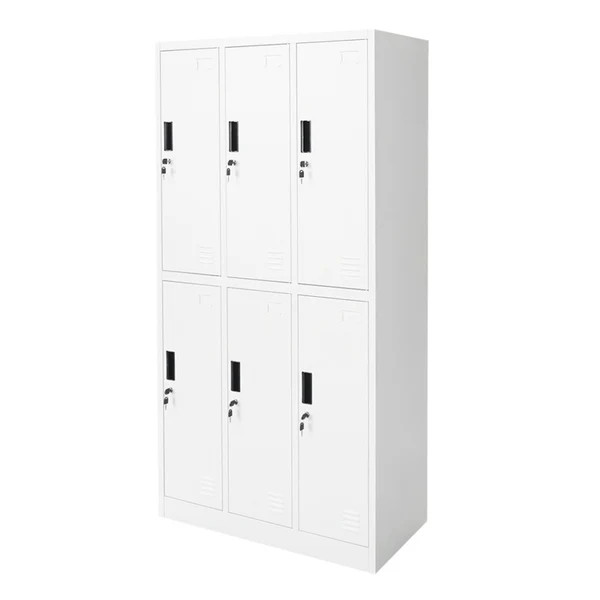 Ez a fém öltözőszekrény ideális választás munkahelyi öltözőkbe, műhelyekbe, raktárakba, intézményekbe és minden olyan környezetbe, ahol fontos a rendezett, biztonságos és tartós tárolás. A 1800x900x450 mm méretű, 3x2 osztású, összesen 6 különálló ajtóval kialakított szekrény több felhasználó számára is praktikus megoldást kínál, miközben a helyet is hatékonyan használja ki.