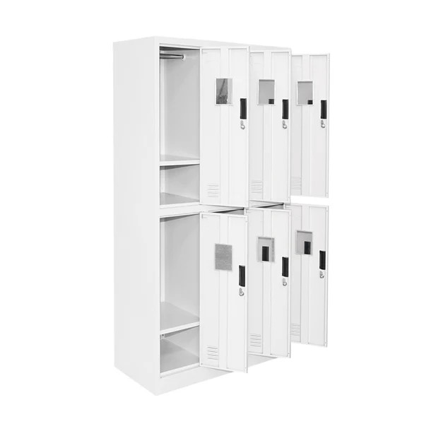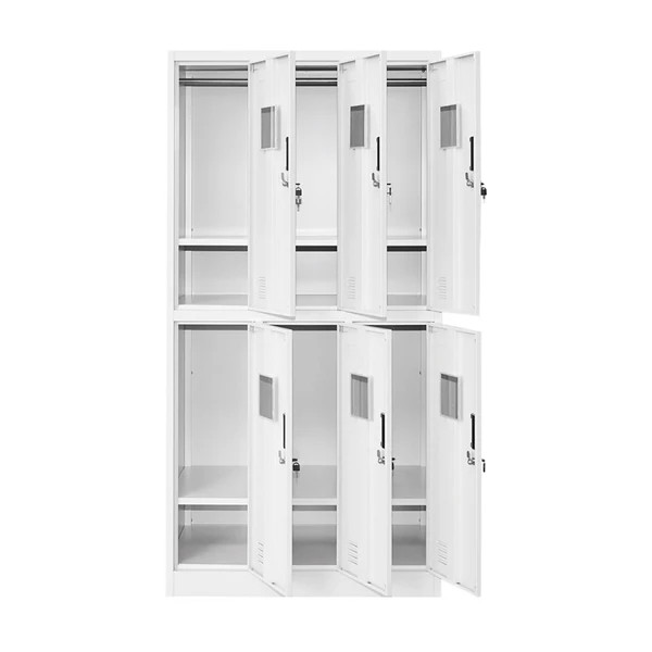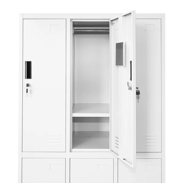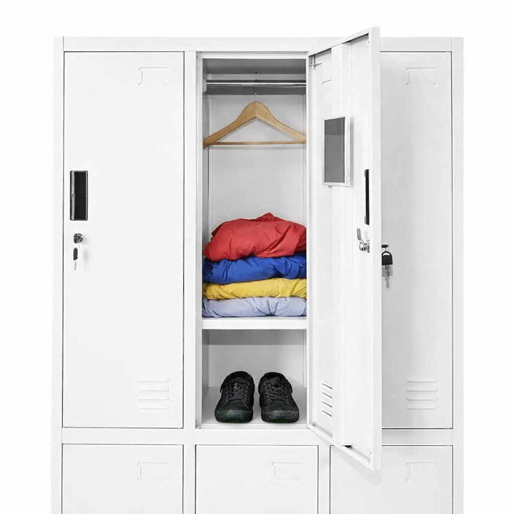 A szekrény minden rekesze úgy lett kialakítva, hogy a mindennapi használat során kényelmes és jól átlátható tárolást biztosítson. Minden ajtó mögött polc található, amely alkalmas kisebb személyes tárgyak, táskák vagy tisztálkodási eszközök elhelyezésére, emellett minden rekeszben ruhaakasztó is helyet kapott, így a kabátok, munkaruhák és váltóruhák is könnyen elrendezhetők. Az ajtók belső oldalán pipere tükör található, ami öltözői használat során különösen praktikus.
