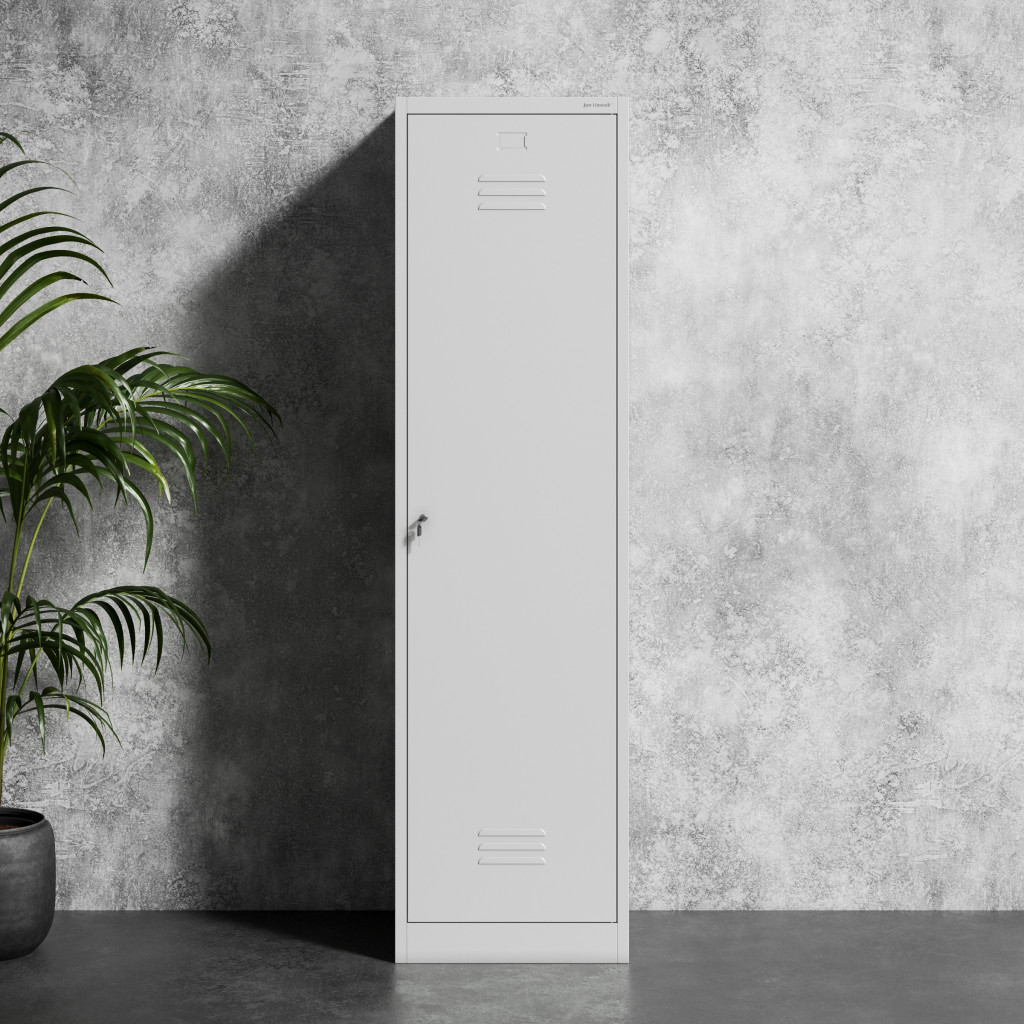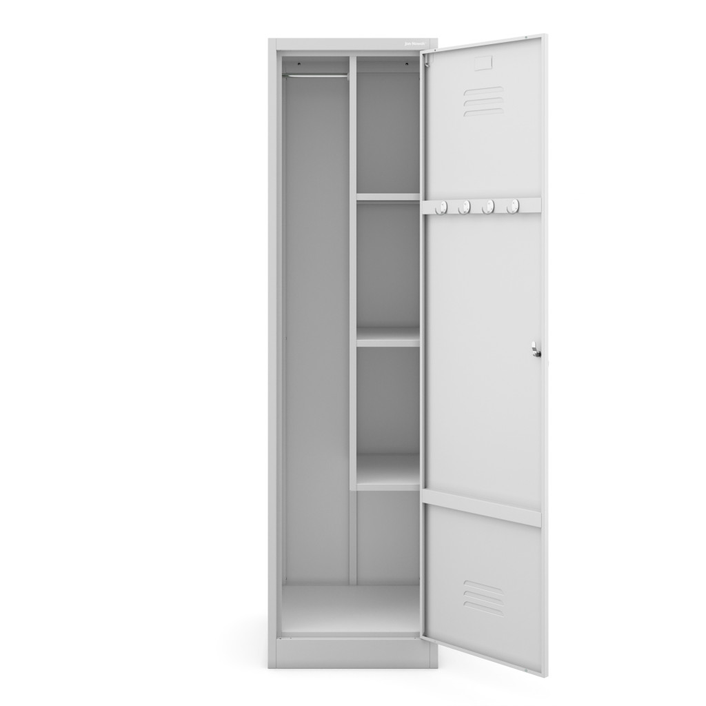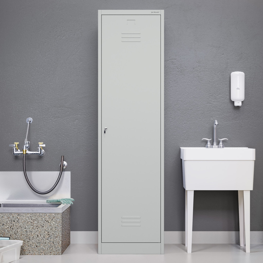A szekrény 0,6 mm vastag fémből készül, amelyet RAL 7035 szürke színű, porszórt bevonat véd a külső behatásoktól. Ez az eljárás nemcsak modern, letisztult megjelenést kölcsönöz a szekrénynek, hanem kiváló korrózió- és karcállóságot is biztosít. Ennek köszönhetően a szekrény még intenzív napi használat mellett is megőrzi minőségét és esztétikus megjelenését. Az 500 x 1850 x 500 mm méretének köszönhetően keskeny, de tágas belső térrel rendelkezik, így akár szűkebb helyiségekbe – például takarítószobákba, műhelyekbe vagy háztartási helyiségekbe – is tökéletes választás.