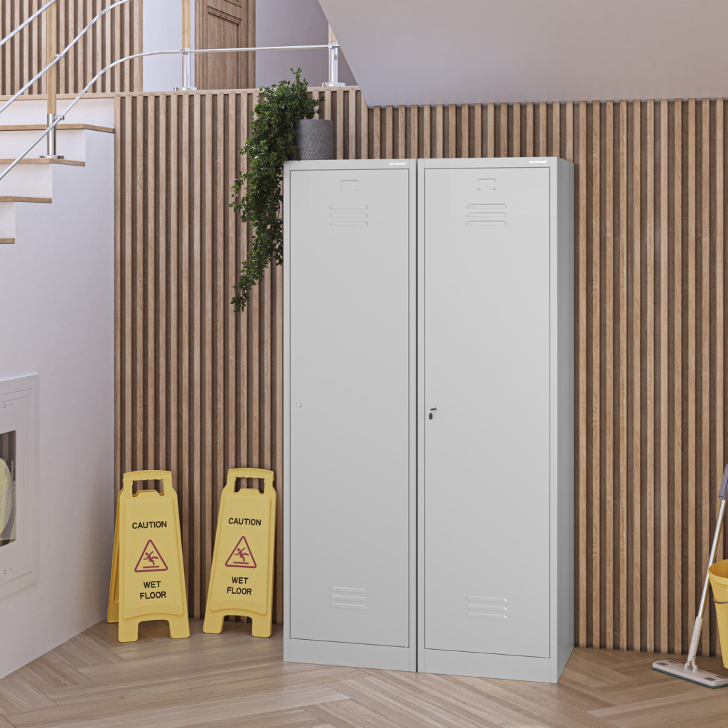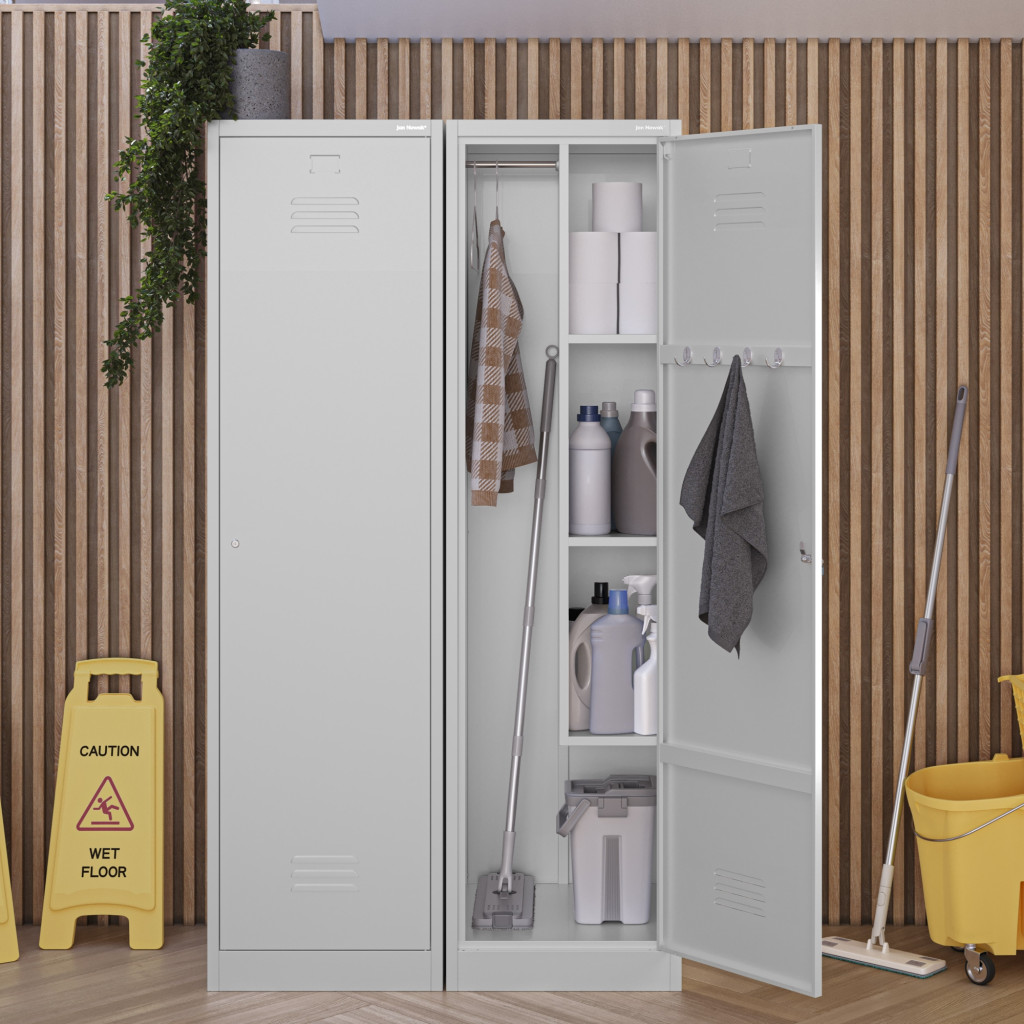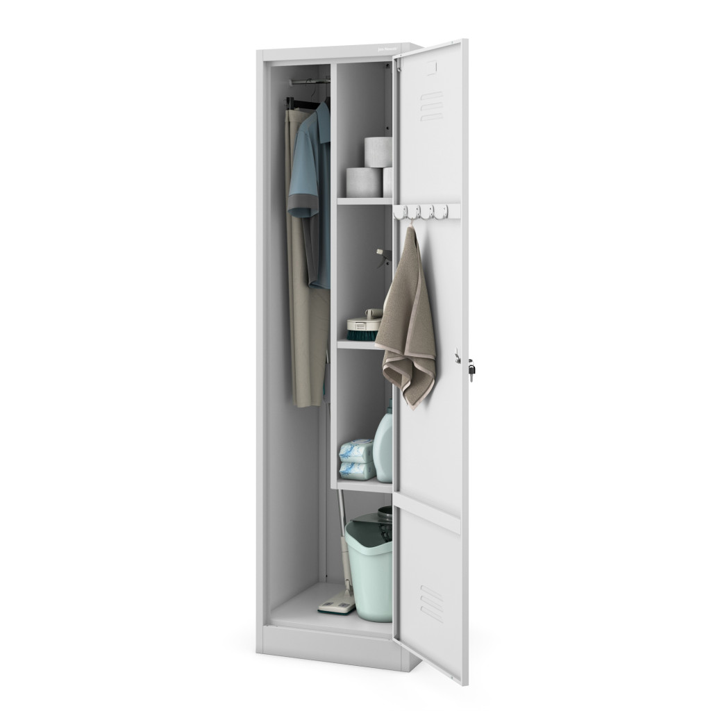 A szekrény 0,6 mm vastag fémből készül, amelyet RAL 7035 szürke színű, porszórt bevonat véd a külső behatásoktól. Ez az eljárás nemcsak modern, letisztult megjelenést kölcsönöz a szekrénynek, hanem kiváló korrózió- és karcállóságot is biztosít. Ennek köszönhetően a szekrény még intenzív napi használat mellett is megőrzi minőségét és esztétikus megjelenését. Az 500 x 1850 x 500 mm méretének köszönhetően keskeny, de tágas belső térrel rendelkezik, így akár szűkebb helyiségekbe – például takarítószobákba, műhelyekbe vagy háztartási helyiségekbe – is tökéletes választás.