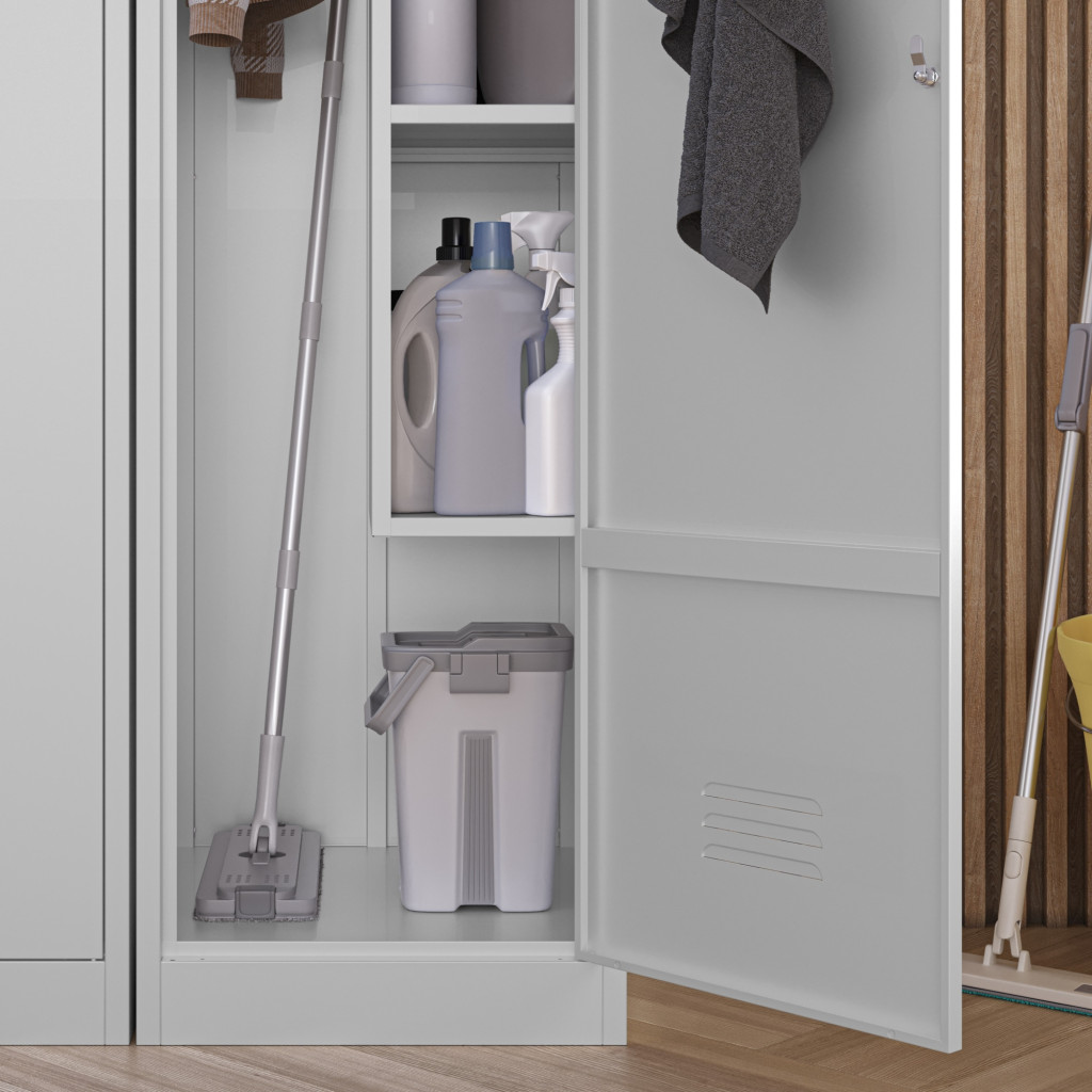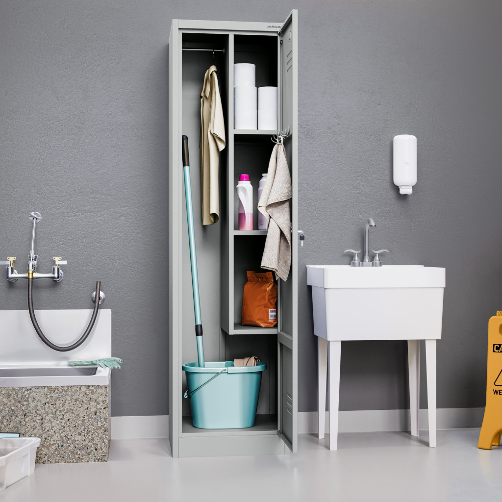 A takarítószerek és tisztítóeszközök rendszerezett, biztonságos és átlátható tárolása elengedhetetlen minden háztartási, irodai vagy ipari környezetben. Az AGNES takarítószerszám szekrény ideális megoldást nyújt erre a célra, hiszen kialakítása a gyakorlatban felmerülő igények alapján született. Robusztus szerkezete, okos tárolási lehetőségei és helytakarékos mérete lehetővé teszi, hogy minden szükséges tisztítószer és felszerelés egyetlen, kompakt egységben kapjon helyet, miközben könnyen hozzáférhető és jól átlátható marad.