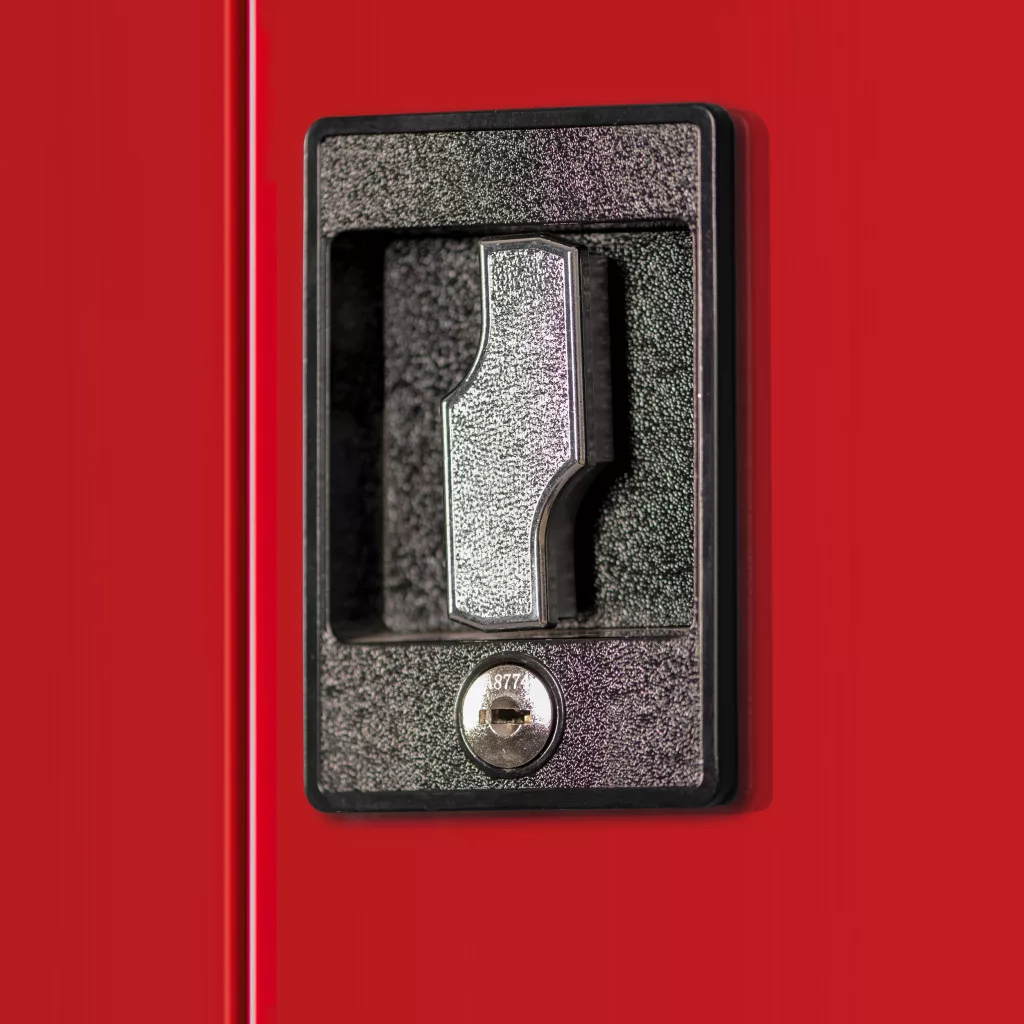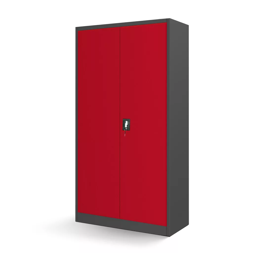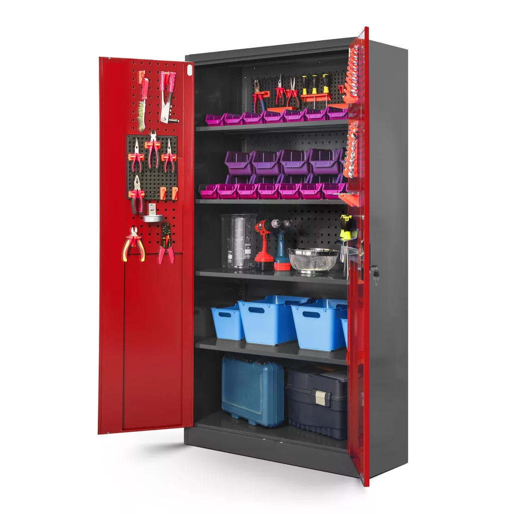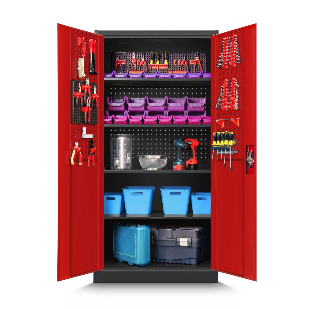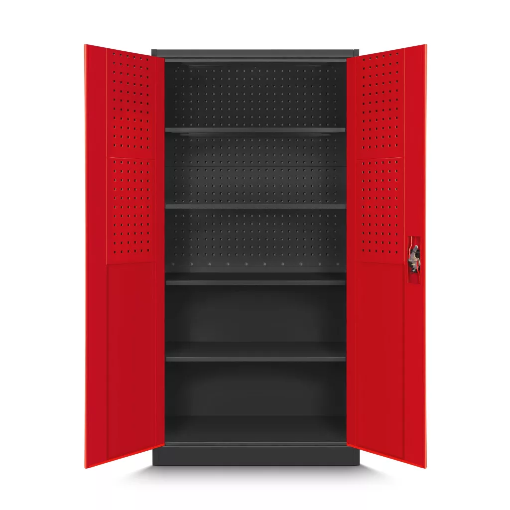 A nagy fesztávú polcok (≈ 895 × 455 mm) kényelmesen elnyelik a szerszámos dobozokat, vegyszereket, gépeket. A hárompontos zárás és a cilinderzár a jogosulatlan hozzáférés kockázatát csökkenti; a két kulccsal a hozzáférés megosztható. A perforált felület kompatibilis a szabványos akasztókkal, így az apróbb kéziszerszámok nem keverednek a polcokon tárolt eszközökkel. A porszórt bevonat tartós, könnyen tisztítható, a szekrény pedig az antracit-piros ipari színkombinációval a műhely berendezéséhez illeszthető.