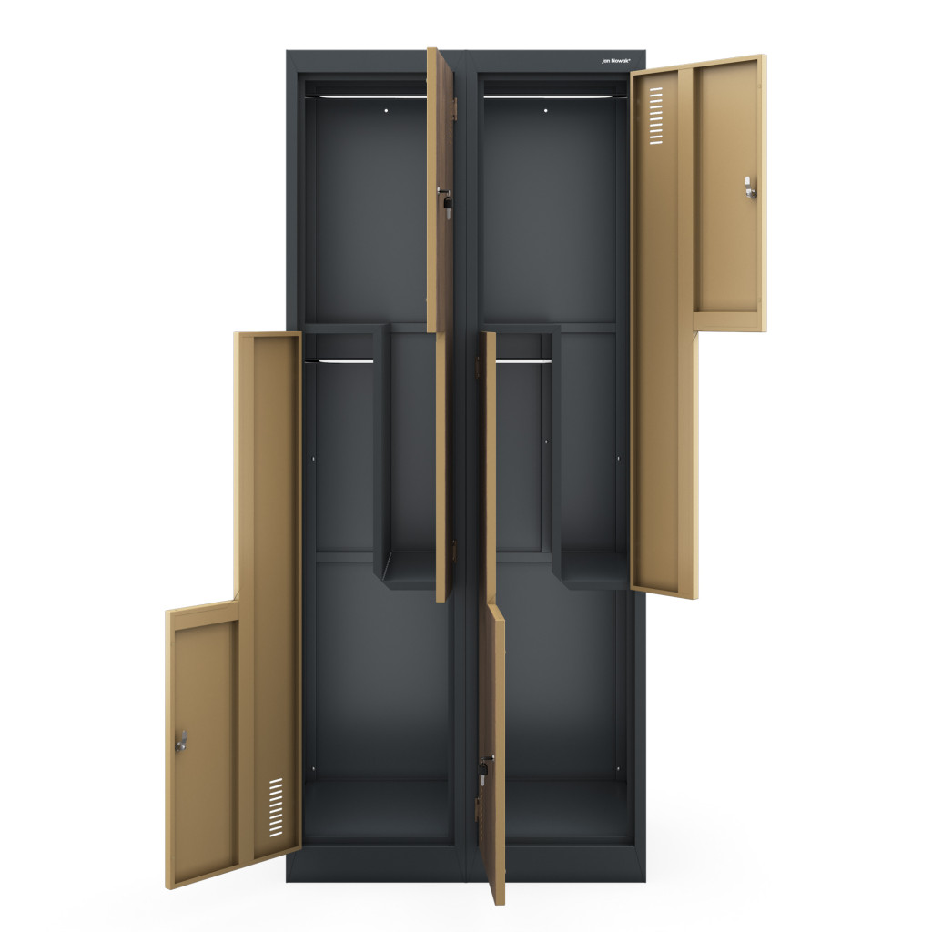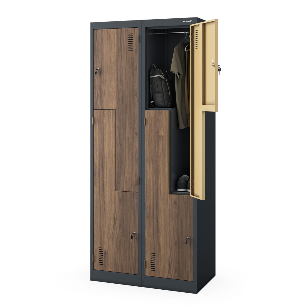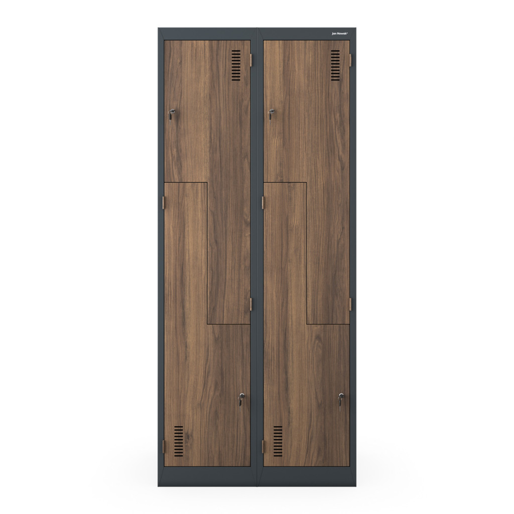 A JULIA fém öltözőszekrény, a JAN NOWAK kollekcióból, egy elegáns és sokoldalú tároló megoldás, amely többféle színben és mintázatban érhető el, így tökéletesen illeszkedik bármilyen környezetbe. Gyakran hivatkoznak rá mint Z-ajtós öltözőszekrény, ami a különleges ajtókialakításnak köszönhető, és ideális választás irodákba, orvosi rendelőkbe, szerszámtárolásra, valamint fitnesztermekbe és iskolákba egyaránt.