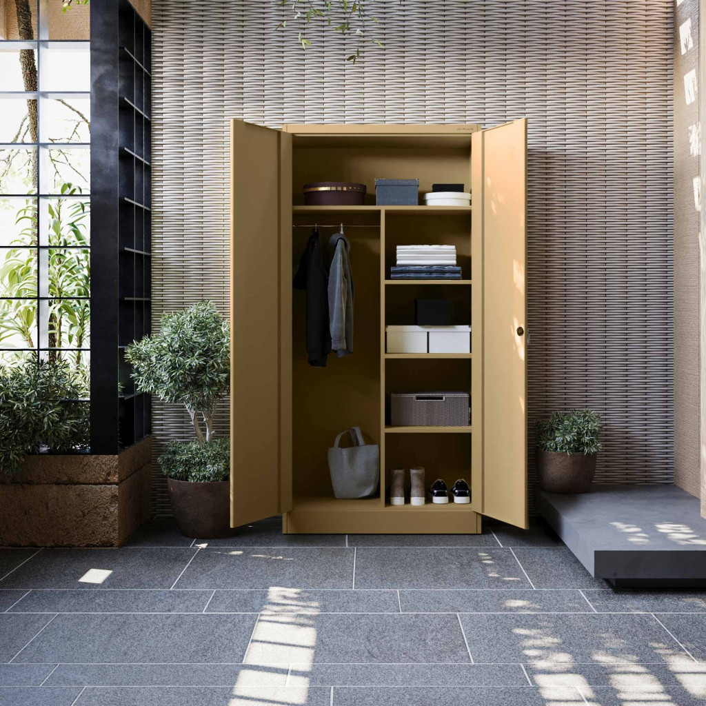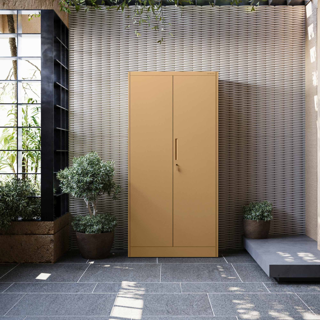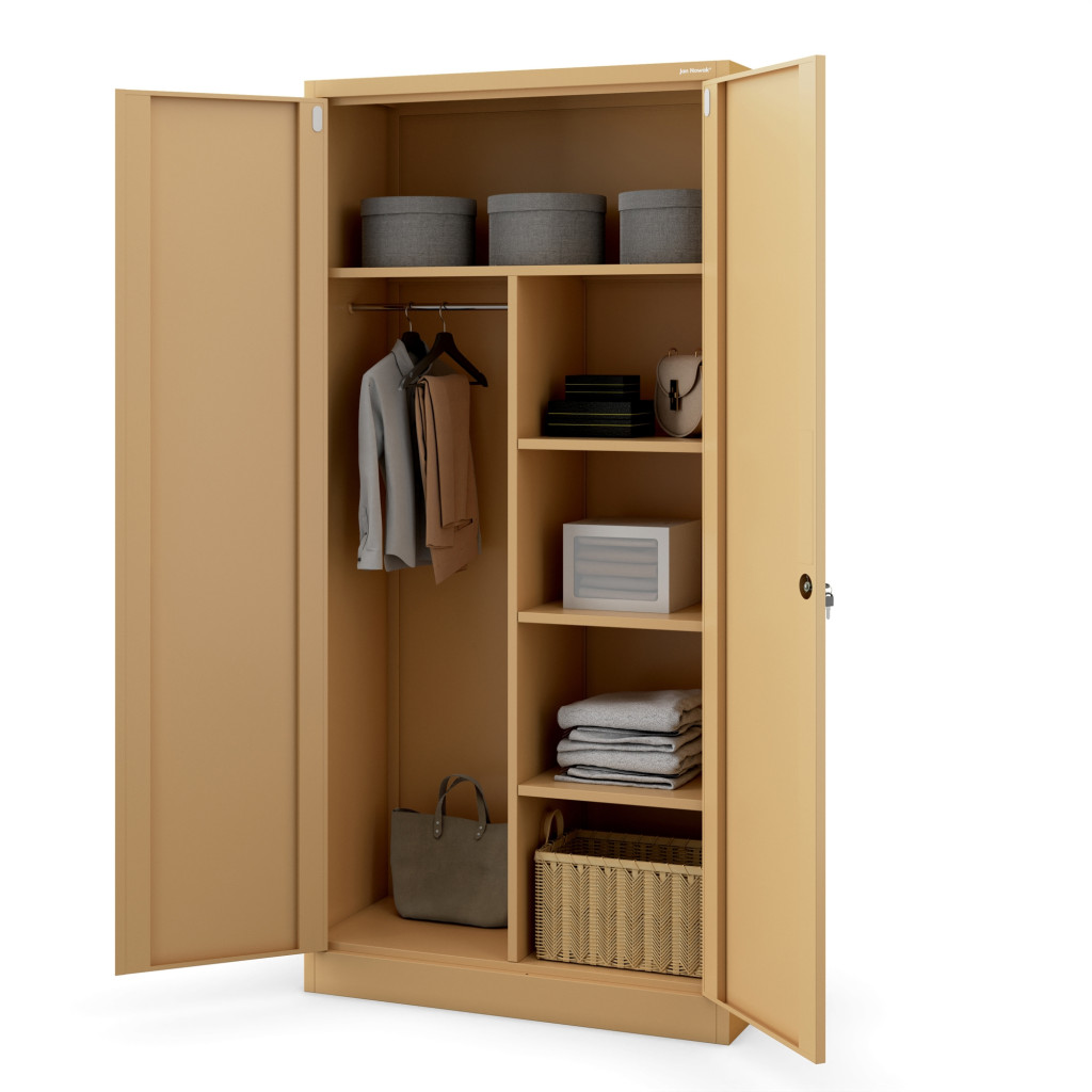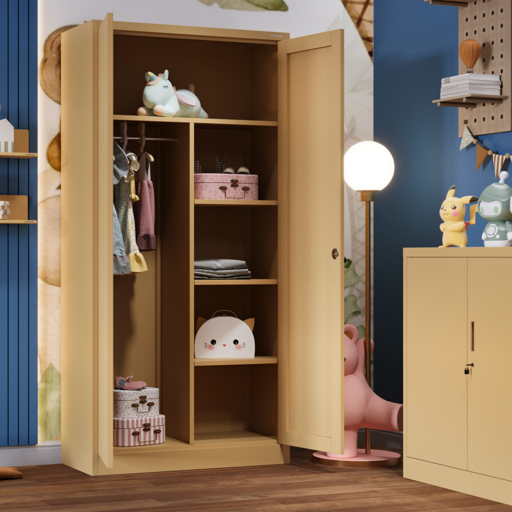 A DAWID kétajtós fémszekrény a tárolás új szintjét képviseli: kívül elegáns, belül pedig rendkívül praktikus kialakítású. A belső tér három külön funkcionális zónára van osztva – egy akasztórúddal ellátott magas rész, állítható polcos szekció, valamint egy felső rekesz áll rendelkezésre, amely a ritkábban használt vagy szezonális tárgyak tárolására tökéletes. Mindez lehetővé teszi a hatékony rendszerezést és a bőséges tárolókapacitást, legyen szó ruházatról, dokumentumokról vagy irodai eszközökről.