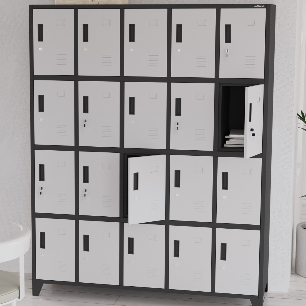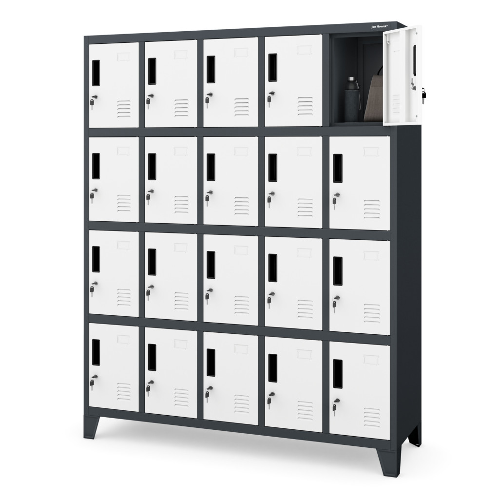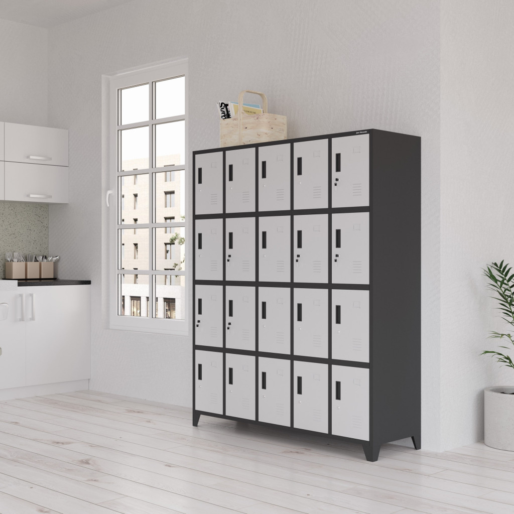 • 20 egyforma méretű rekesz: mindegyik 36 cm magas, 24 cm széles és 45 cm mély, ideális személyes tárgyak, könyvek, sportfelszerelések tárolására.