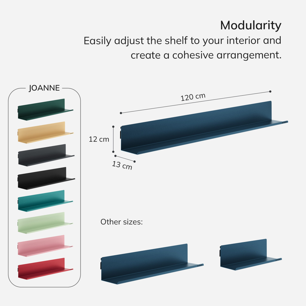 A JOANNE sötétkék fali polc nemcsak esztétikus, hanem rendkívül praktikus is. A 1200 mm szélességének köszönhetően bőséges helyet kínál könyveid, dekorációid vagy akár személyes tárgyaid számára.