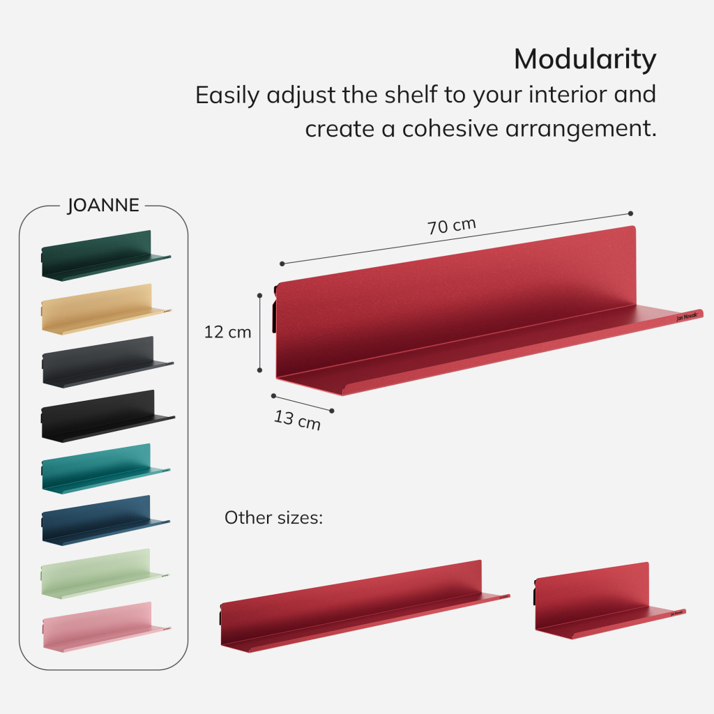 A JOANNE fali polc nemcsak praktikus, hanem stílusos kiegészítője is otthonának. Élénk piros színe azonnal vonzza a tekintetet, míg a 700 mm-es szélessége elegendő helyet kínál a különféle tárgyak elhelyezésére.