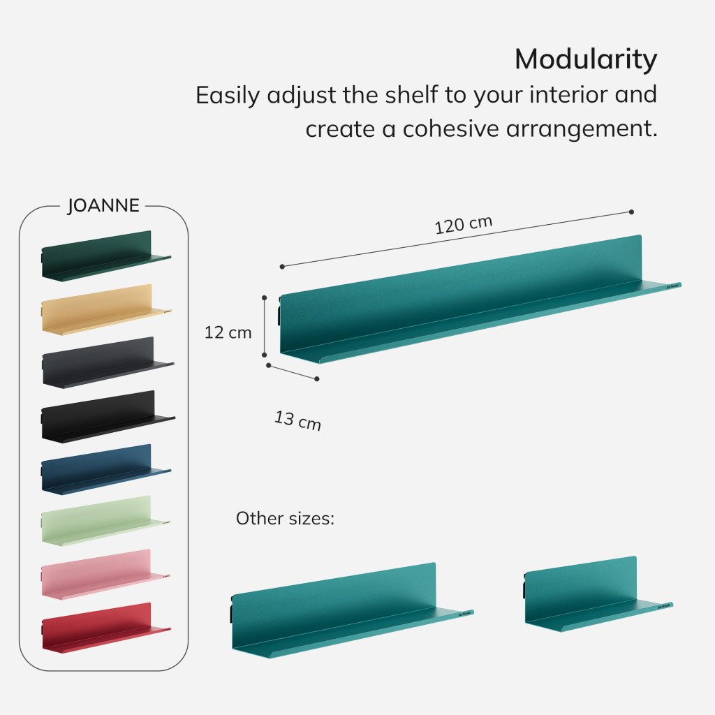 A JOANNE Wall Shelf Sea Green W1200 nemcsak stílusos, de rendkívül praktikus is. Letisztult vonalvezetése és a finom tengeri zöld szín modern megjelenést kölcsönöz, amely könnyedén beleillik bármilyen otthoni dekorációba.