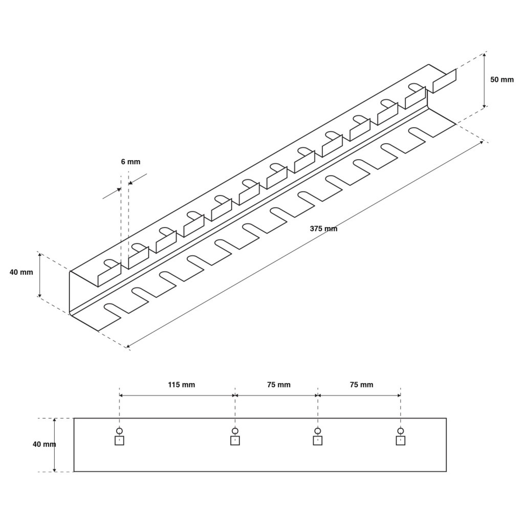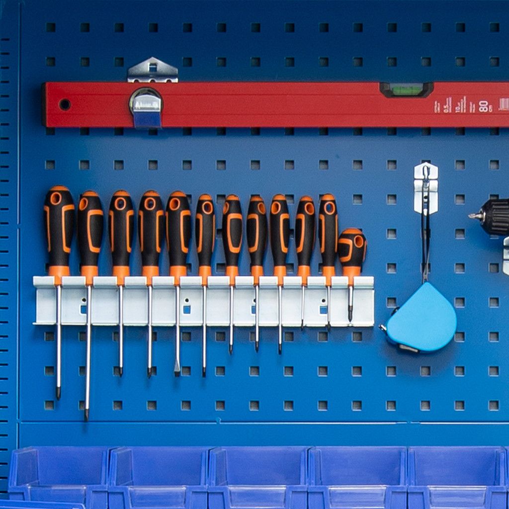 A tartó magas minőségű, porfestett acéllemezből készül, amely ellenáll a korróziónak és a mechanikai sérüléseknek. A precíz kialakításnak köszönhetően stabilan tartja a csavarhúzókat, fogókat vagy más, hasonló méretű szerszámokat, miközben átlátható és rendezett tárolási megoldást biztosít.