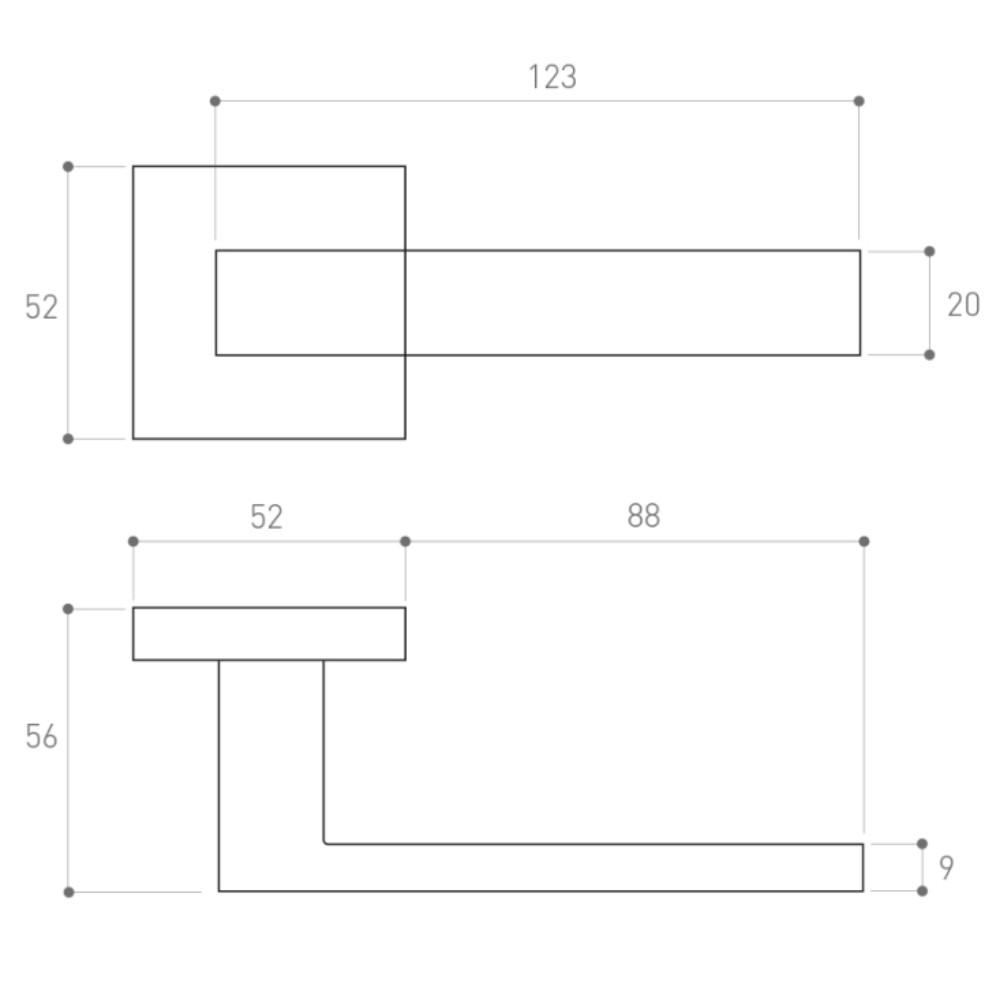 •alumínium ajtókilincs•modern beltéri ajtókhoz•szögletes rozetta és kilincs forma•mindkét oldalon rugós mechanizmussal•kilincs lenyomás után visszaáll vízszintes helyzetbe•105 mm hosszú, 8 x 8 mm-es kilincs tengely•70 mm hosszú (méretre vágható) rögzítő csavar•zártakaró rozetta küldöm kapható•felszereléshez szükséges anyagokkal•többféle színben áruljuk•kilincs hossz: 125 mm•rozetta méret: 52 x 52 mm