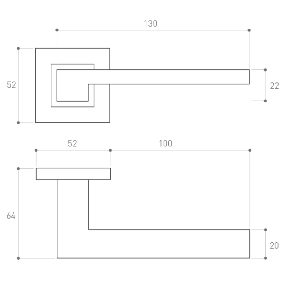 •alumínium ajtókilincs•modern beltéri ajtókhoz•szögletes rozetta és kilincs forma•mindkét oldalon rugós mechanizmussal•kilincs lenyomás után visszaáll vízszintes helyzetbe•105 mm hosszú, 8 x 8 mm-es kilincs tengely•70 mm hosszú (méretre vágható) rögzítő csavar•zártakaró rozetta küldöm kapható•felszereléshez szükséges anyagokkal•többféle színben áruljuk•kilincs hossz: 130 mm•rozetta méret: 52 x 52 mm