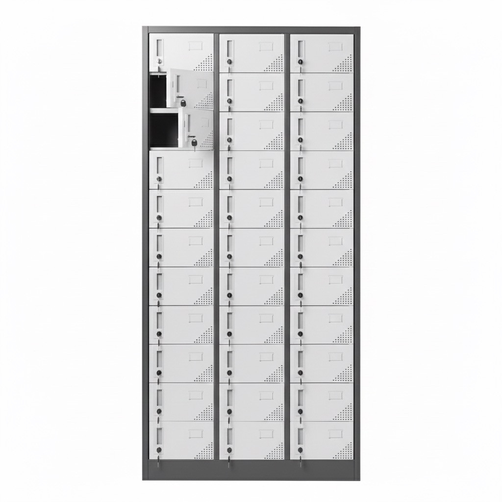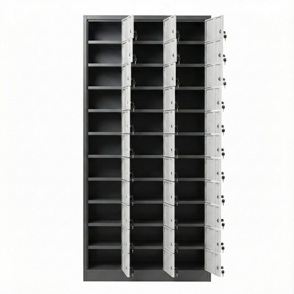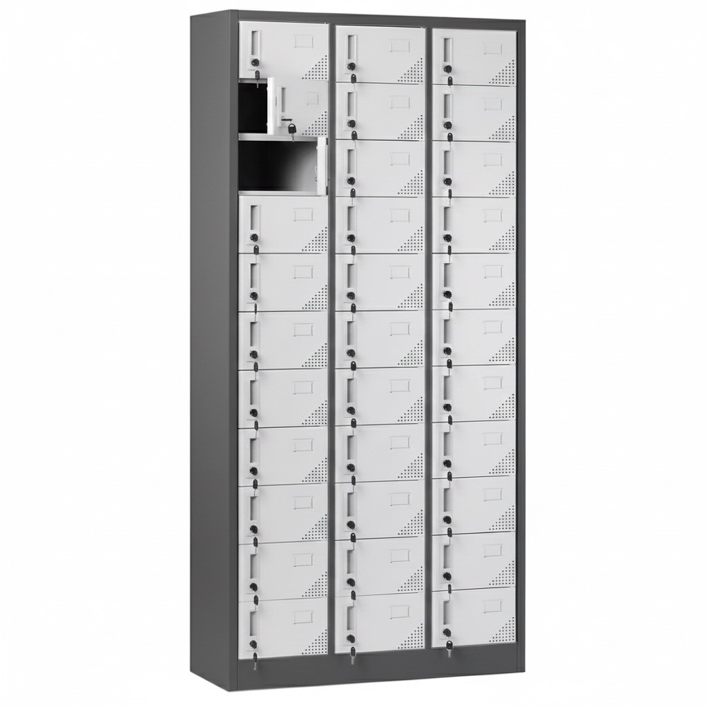 A szekrény összesen 33 rekesszel rendelkezik. A rekeszek mérete lehetővé teszi mobiltelefonok, kisebb pénztárcák vagy egyéb személyes tárgyak elkülönített elhelyezését. A gyártói paraméterek szerint a szekrény teljes mérete magasság 1850 mm, szélesség 900 mm, mélység 350 mm. A rekeszek belső mérete közel magasság 275 mm, szélesség 150 mm, mélység 300 mm, az ajtónyílás mérete megközelítőleg magasság 240 mm, szélesség 145 mm. Ezek az értékek alkalmassá teszik a rekeszeket egy-egy telefon, töltő és kisebb személyes tárgy együttes tárolására.