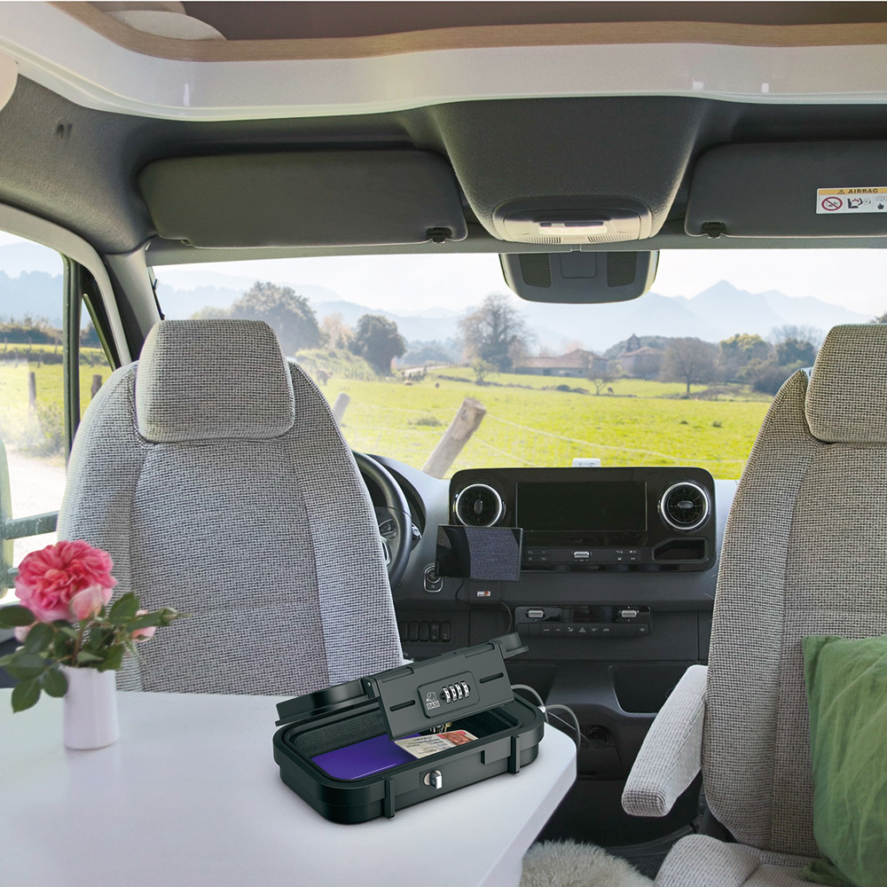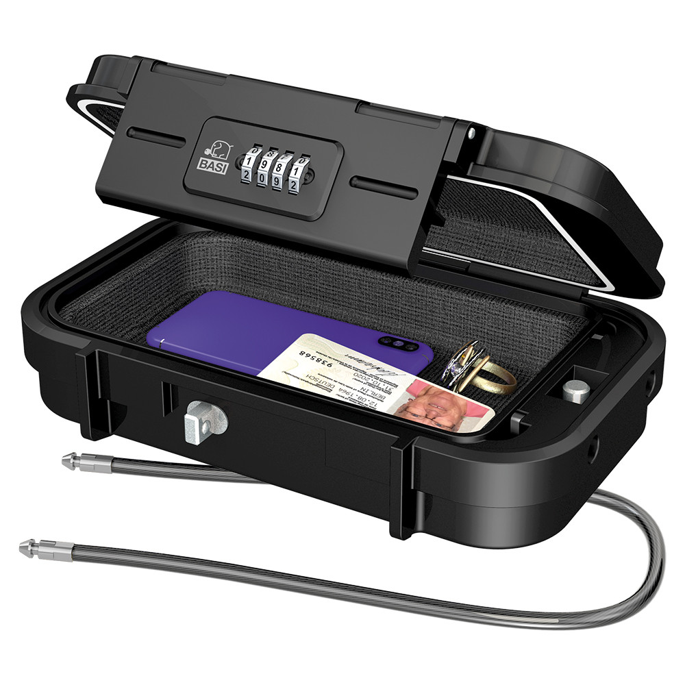 •törésálló ABS műanyag kazetta•víz elleni védelem (IPX5 minősítéssel)•puhán bélelt belső•négy tárcsás számzár•átkódolható számkombináció•5 mm átmérőjű, 54 cm hosszú rögzítő sodrony•felszerelhető autóba, lakókocsiba, hajóba•alkalmas késméretű értéktárgyak megóvására•például pénztárca, útlevél, mobiltelefon, navigáció