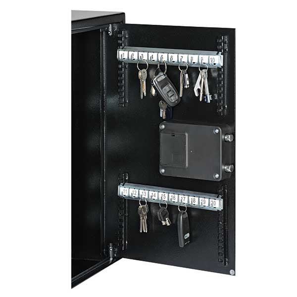 • elektronikus kulcsszekrény besurranó tolvajok ellen• kivehető, állítható magasságú kulcsakasztókkal• 2 mm-es acél test és 3 mm-es acél ajtó• 90 fokos ajtónyitás jobboldali zsanérokkal• egyirányú zárás 16 mm-es kerek acél hevederekkel• elektronikus számkombinációs zár• 3-8 számjegy közötti felhasználói kód• 4 téves kódbevitel után 3 perces büntetőidő• mechanikus vésznyitási lehetőség körkulccsal• zár 4 db Mignon LR 6 AA 1,5V elemmel működik• kilincs 20 mm-t áll ki az ajtó síkjából• 4db, 8mm-es rögzítő furat a kulcsszekrény hátfalán• fekete színben, rögzítő csavarokkal, elemekkel áruljuk