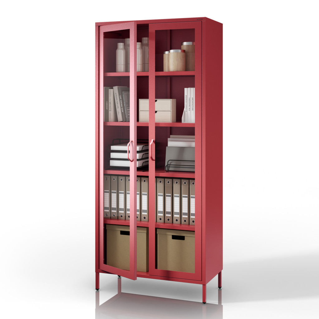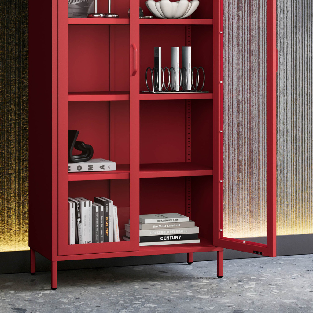 A kétajtós konstrukció 0,6 mm vastag acélvázzal készül, ami kimagasló stabilitást ad ennek a méretes darabnak. A nagy tisztaságú edzett üvegajtók mögött négy, 25 mm-enként állítható polc található, amelyek akár 40 kg terhelést is elbírnak. Így mind a dekorációk, prémium porcelánok, fényképek, vitrintárgyak vagy gyűjtemények tökéletes helyet találhatnak benne — rendezett módon, mégis látványosan bemutatva.