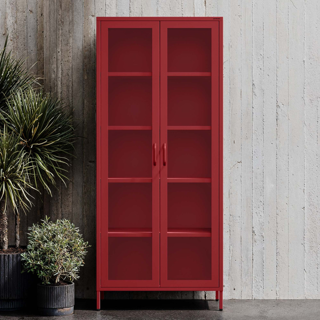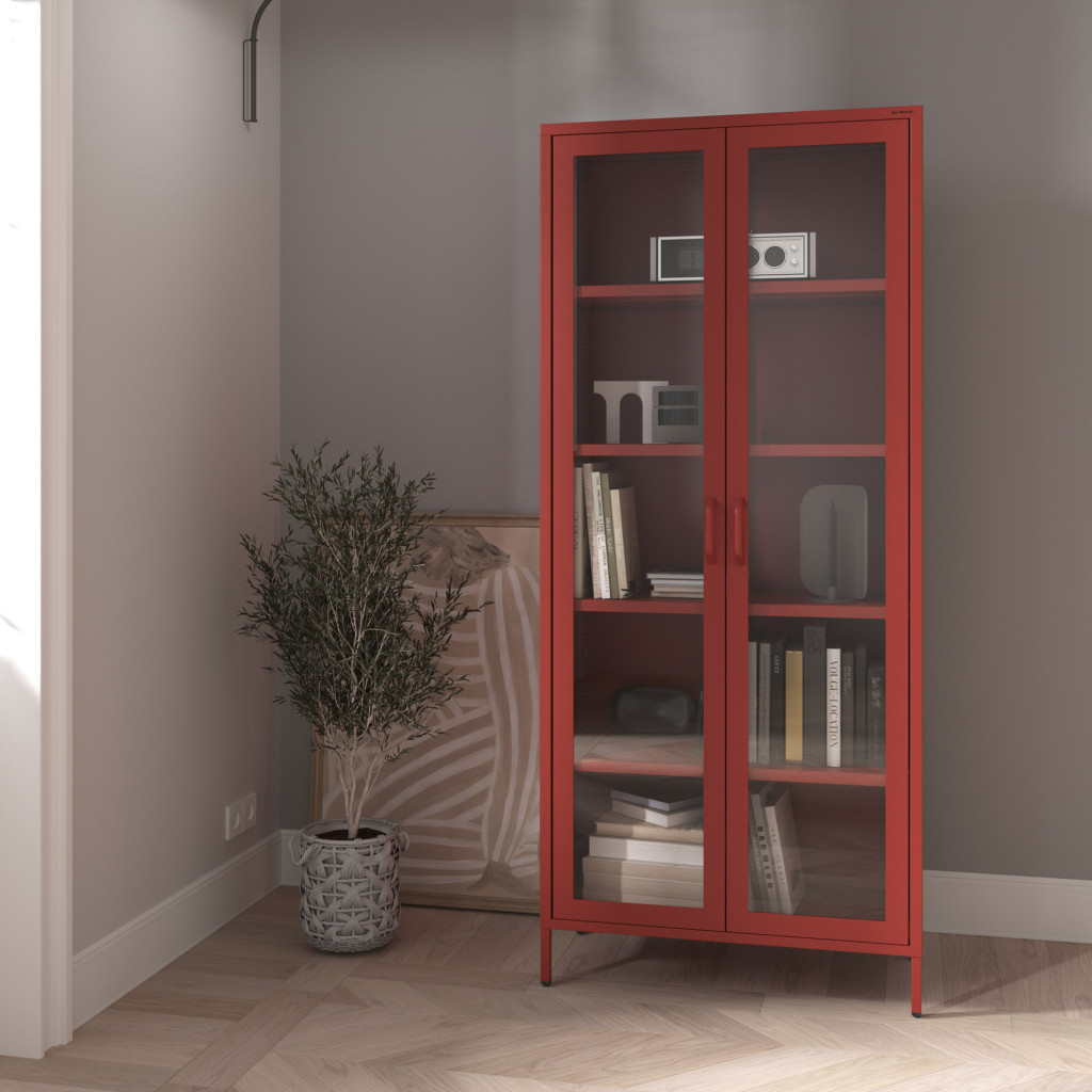A piros ANGELO fém vitrinszekrény az a bútor, ami nagyon ritkán jön szembe: határozott karakter, elegáns formák és olyan vizuális erő, amely az egész helyiséget új hangulatba borítja. A Modern kollekció egyik legmerészebb darabja, amely a Sparkling Brilliance™ bevonatnak köszönhetően nem egyszerűen “piros”, hanem mély, csillogó, fényben életre kelő árnyalatot kap. Az apró, csillámló szemcsék meleg fényben szinte izzásig ragyognak, így a vitrin valódi fókuszponttá válik bármely nappaliban vagy irodában.