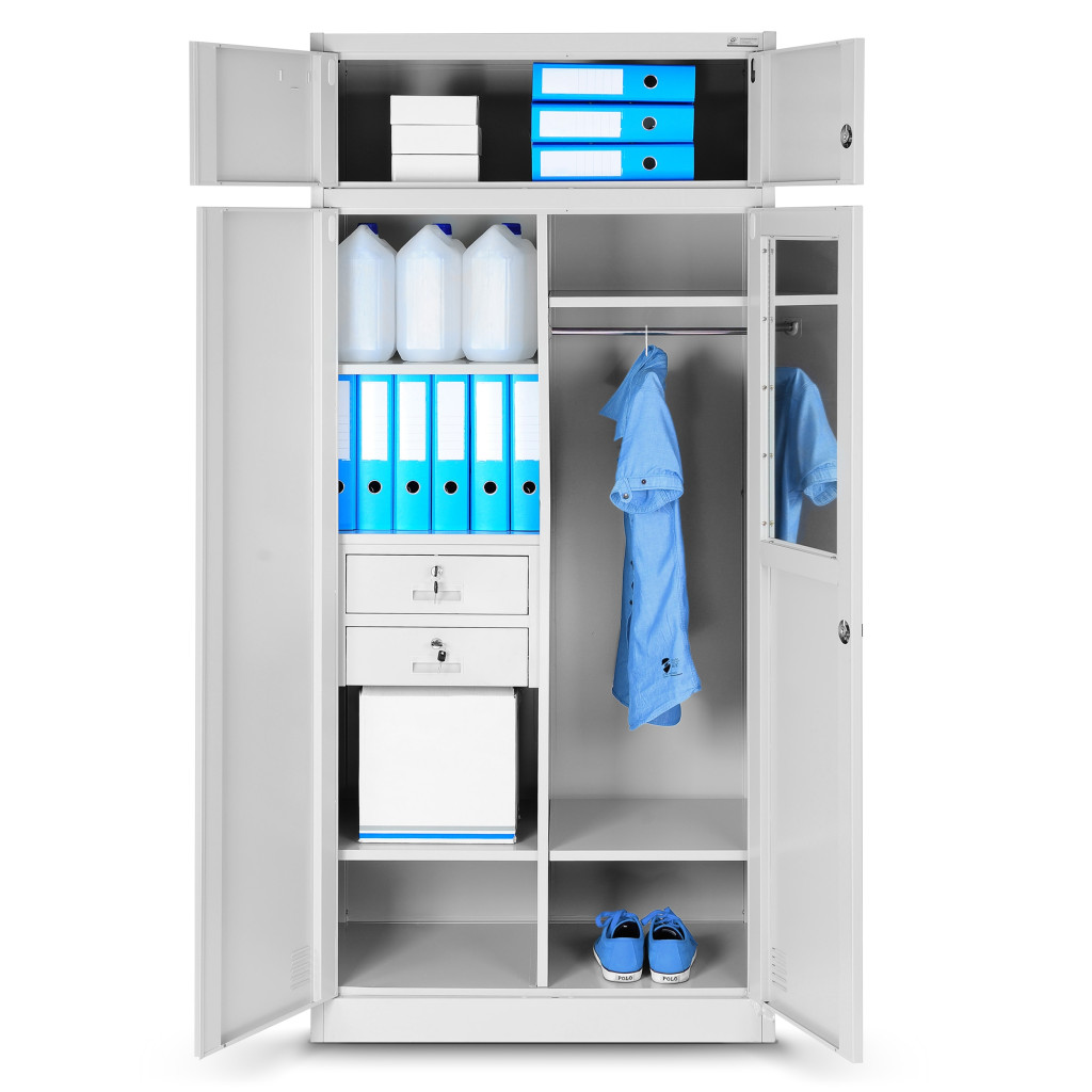 A BORYS fém öltözőszekrény egy sokoldalúan használható darab, amely kulccsal zárható ajtókkal rendelkezik és széles körben alkalmazható irodákban és szociális helyiségekben.