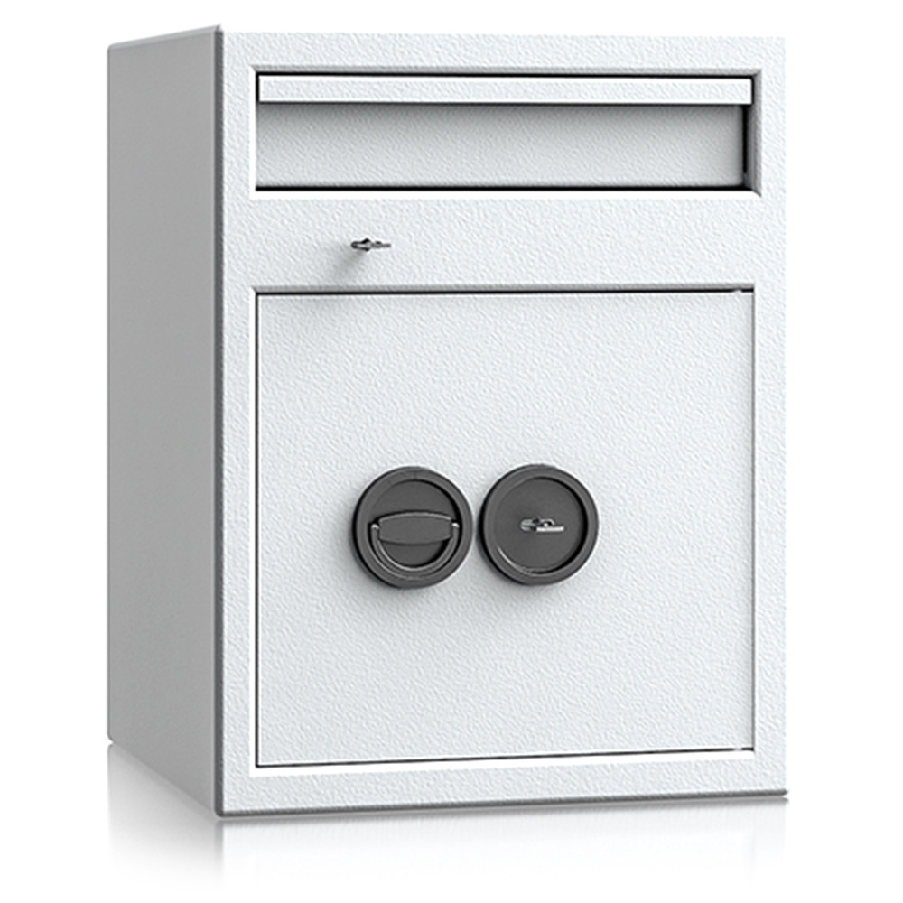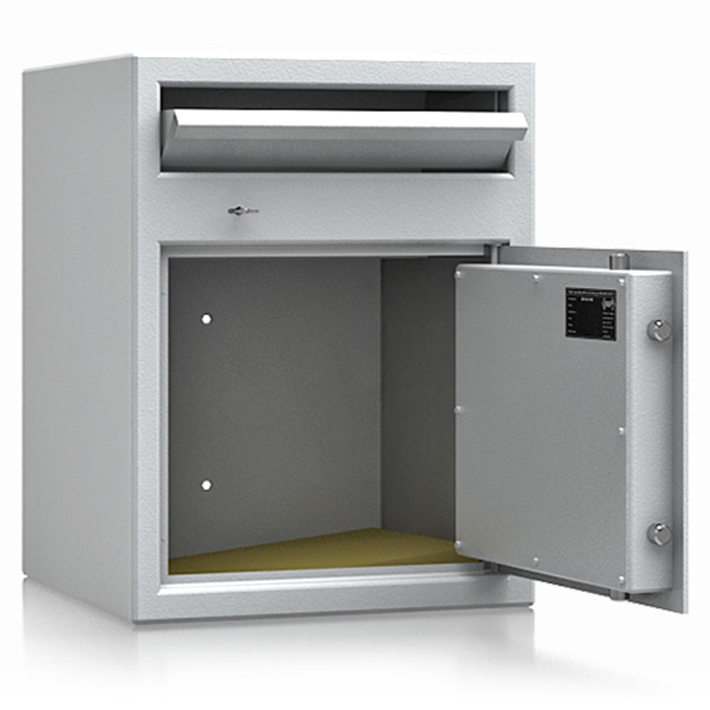 •lefelé nyíló csúszdás bedobó szerkezet•bedobó nyílás külön zárható (2 db kulccsal)•maximális kihalászás elleni védelem•3 mm vastag egyfalú acél test•52 mm vastag duplafalú ajtó, 6 mm-es acél borítással•90 fokban jobbra nyíló ajtó, belső zsanérokkal•háromirányú zárás, kerek acél hevederekkel•felfúrás ellen mangán acéllappal védett zárszerkezet•alapkivitelben duplatollú kulcsos zárral, 2 db kulccsal•felár ellenében más zárral is rendelhető•12 mm-t kiálló fém fogantyú•rögzítő furatok lefelé és hátrafelé