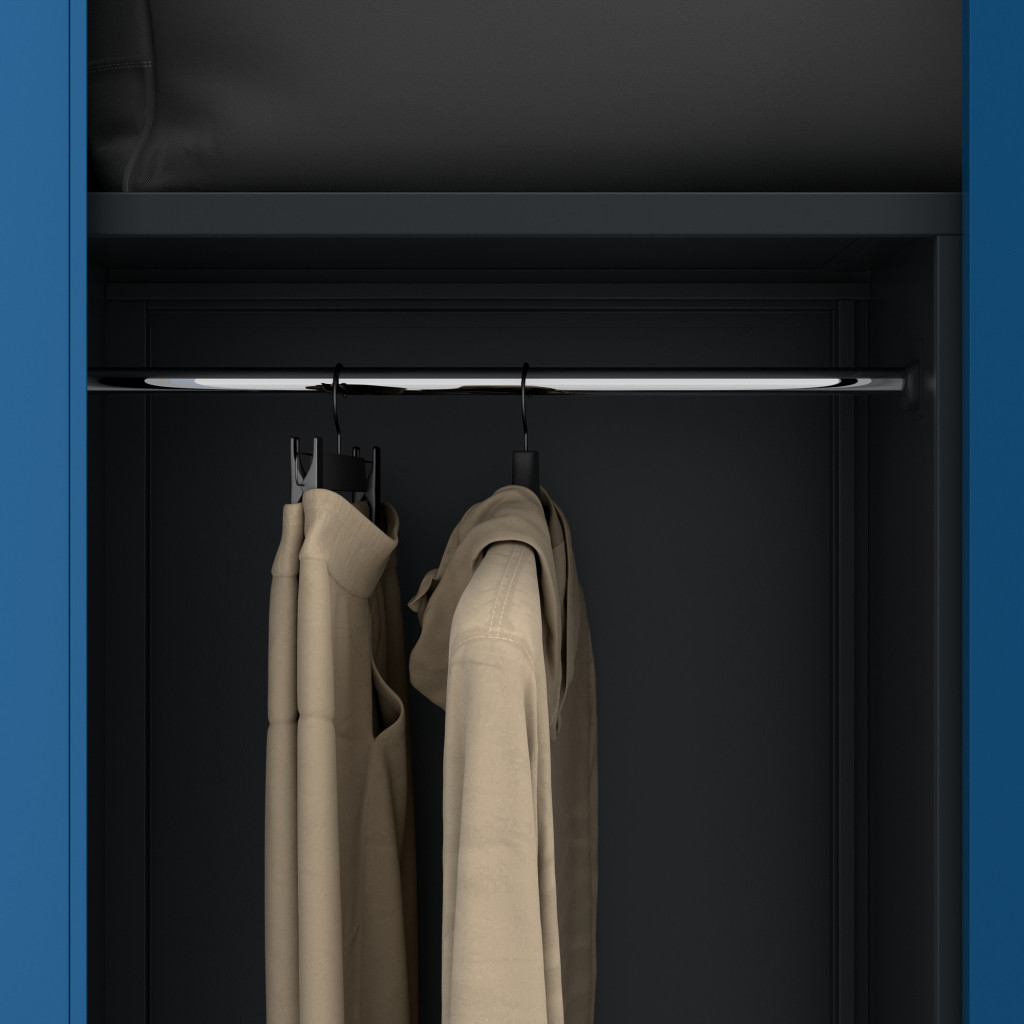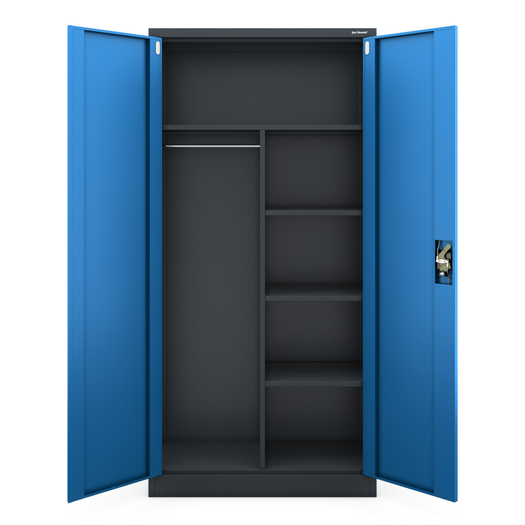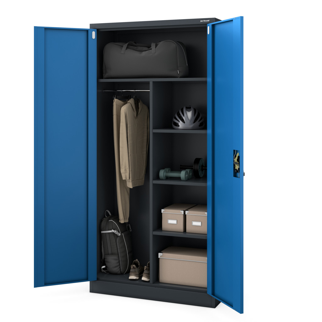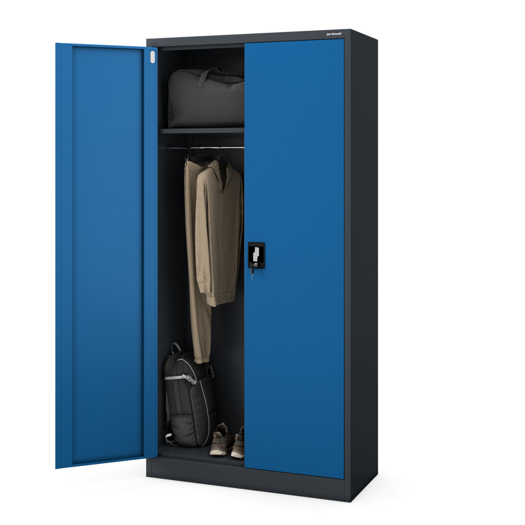 A DAWID szekrény a letisztult antracit és kék színkombinációjával nemcsak esztétikai szempontból, hanem funkcionálisan is kiváló választás. Az ajtók mögött rejlő polcok és akasztók bőséges helyet biztosítanak különböző tárgyak tárolására.