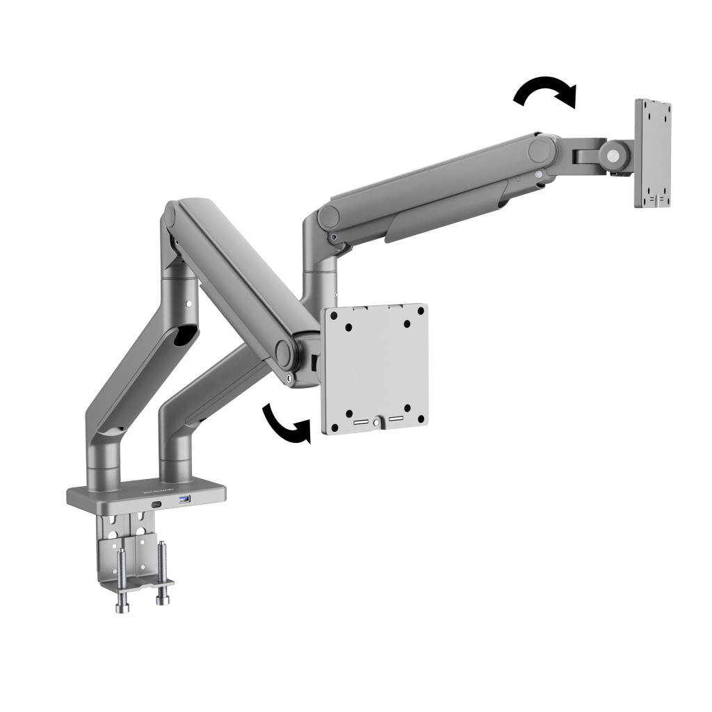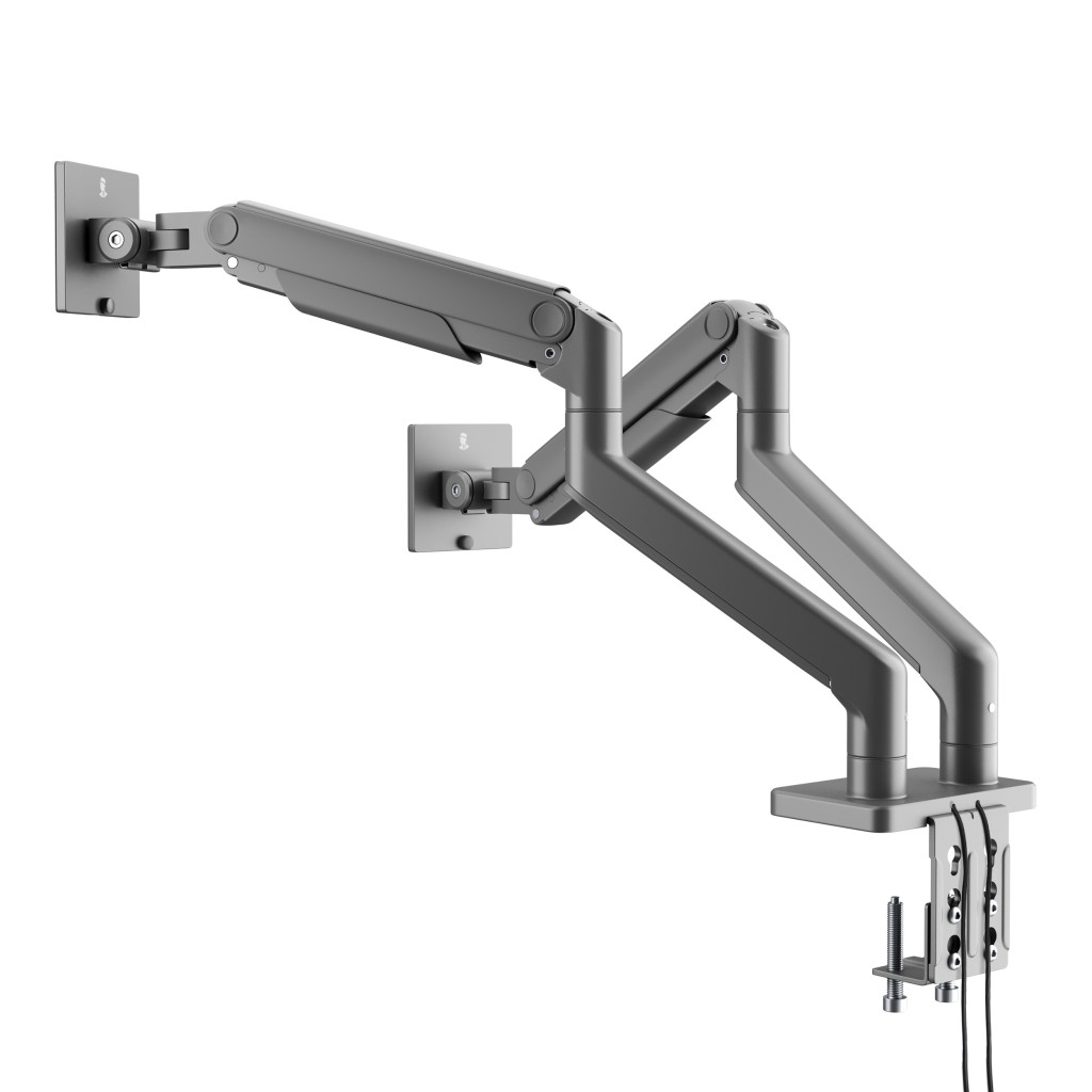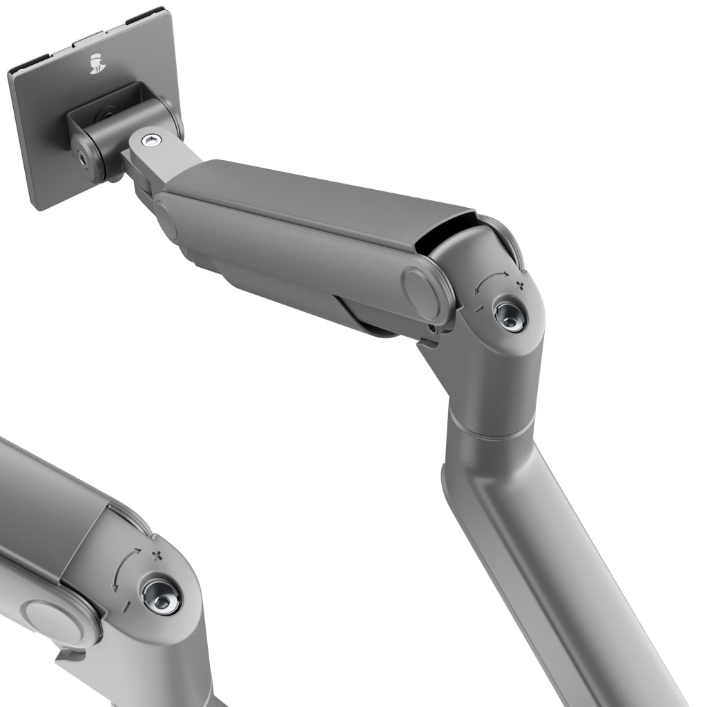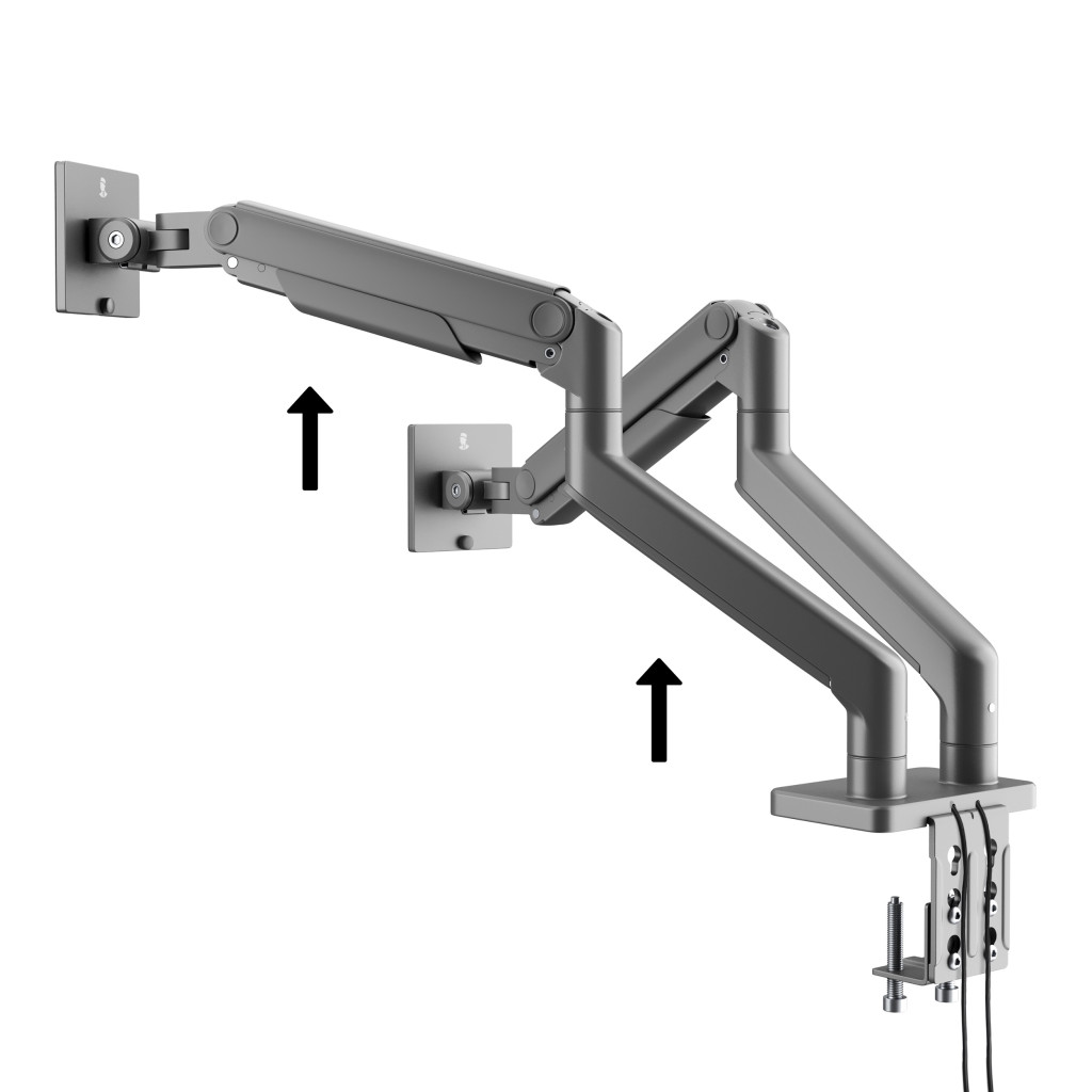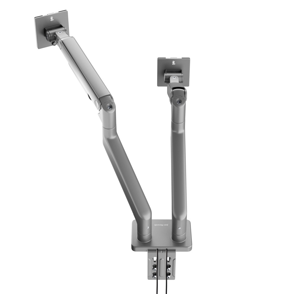 Az állvány mindkét monitortartó karja két komponensből áll, így azok magassága, dőlésszöge és pozíciója igény szerint állítható.