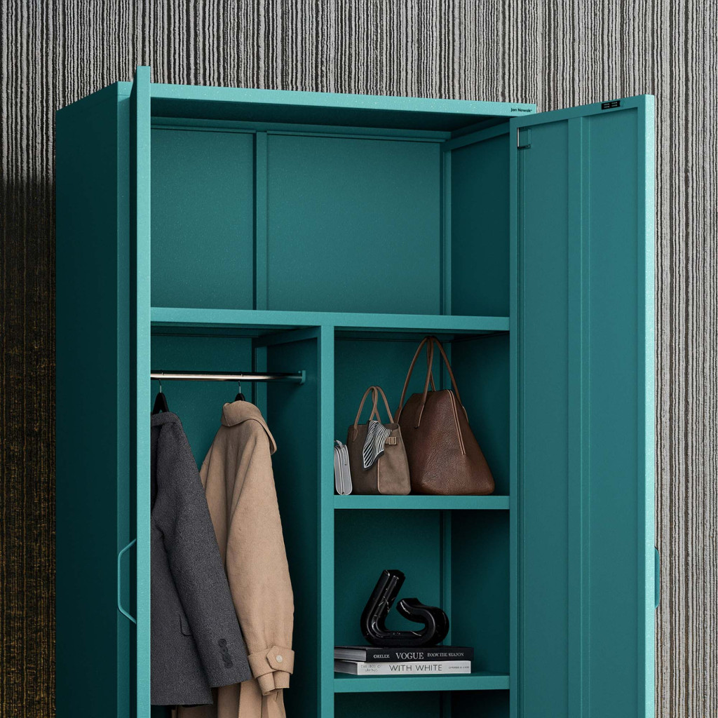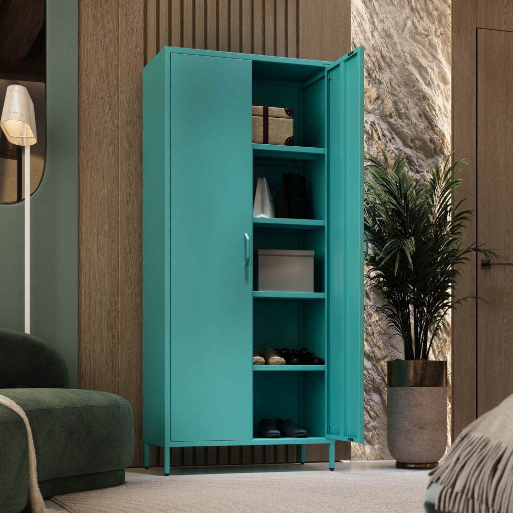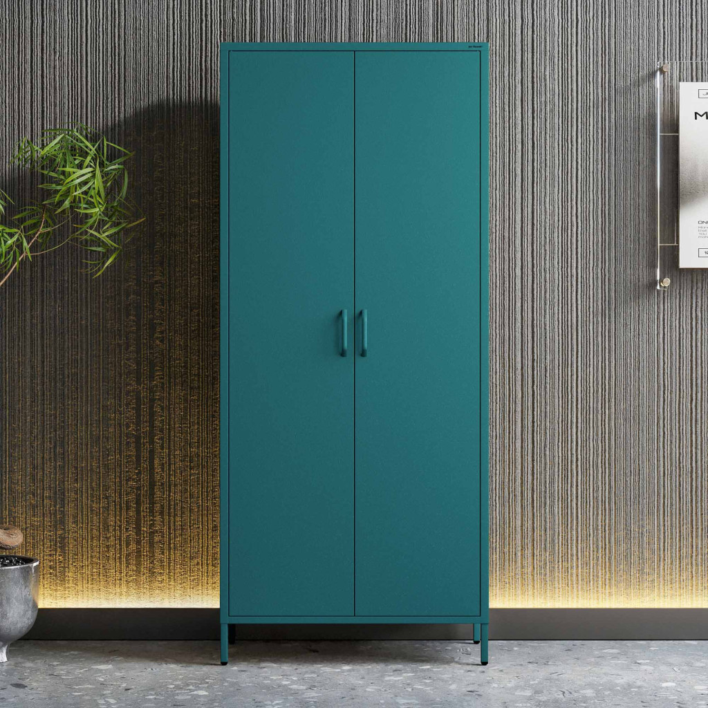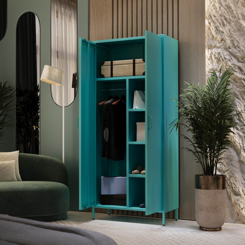 A türkiz FLAVIO fém gardróbszekrény a modern enteriőrök igazi különc szépsége: egyszerre praktikus, magabiztos, és tele van olyan apró részlettel, amely miatt újra és újra ránézel. A Sparkling Brilliance™ bevonat különleges türkiz árnyalata fényben olyan finom csillogást hoz létre, mintha egy óceánfelszín mozdulna meg a szobában — ettől a bútor nem egyszerű tároló, hanem látványelem is, amely saját hangulatot teremt maga körül.