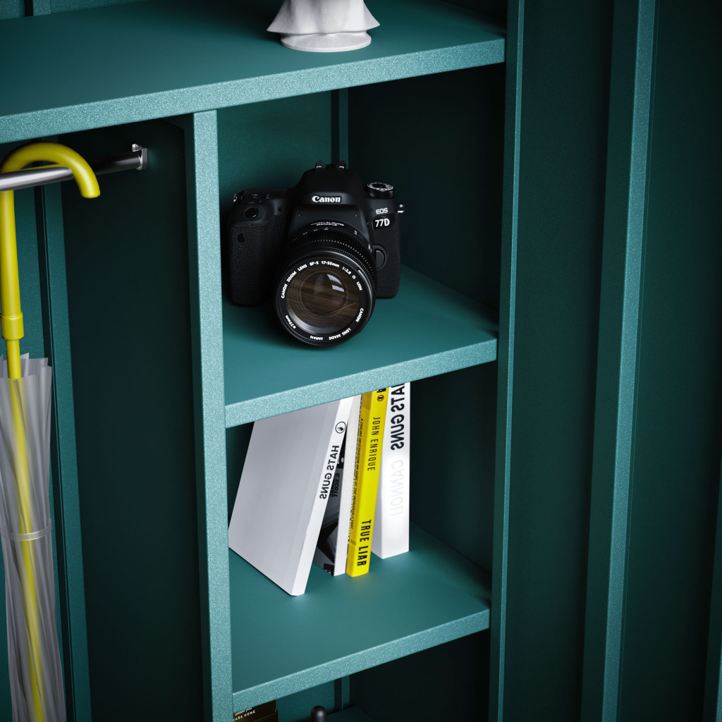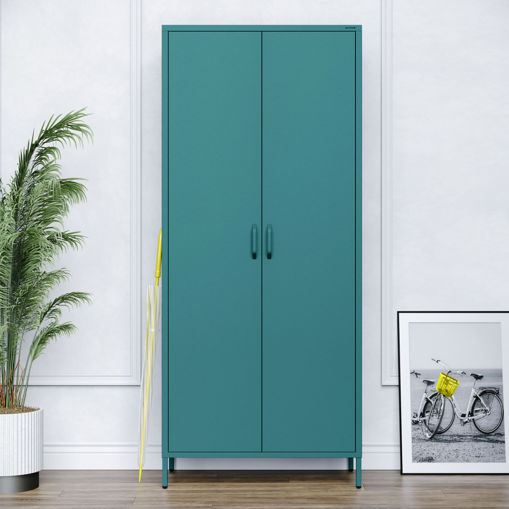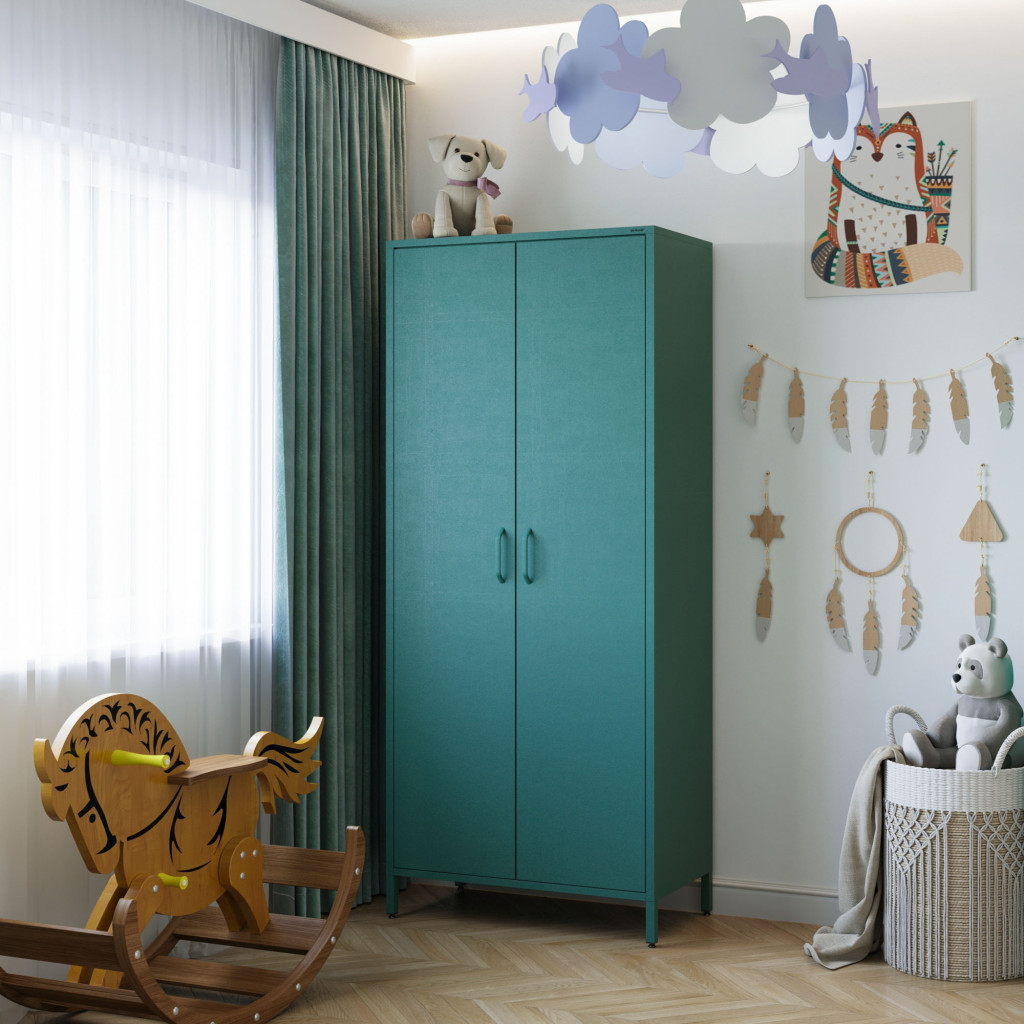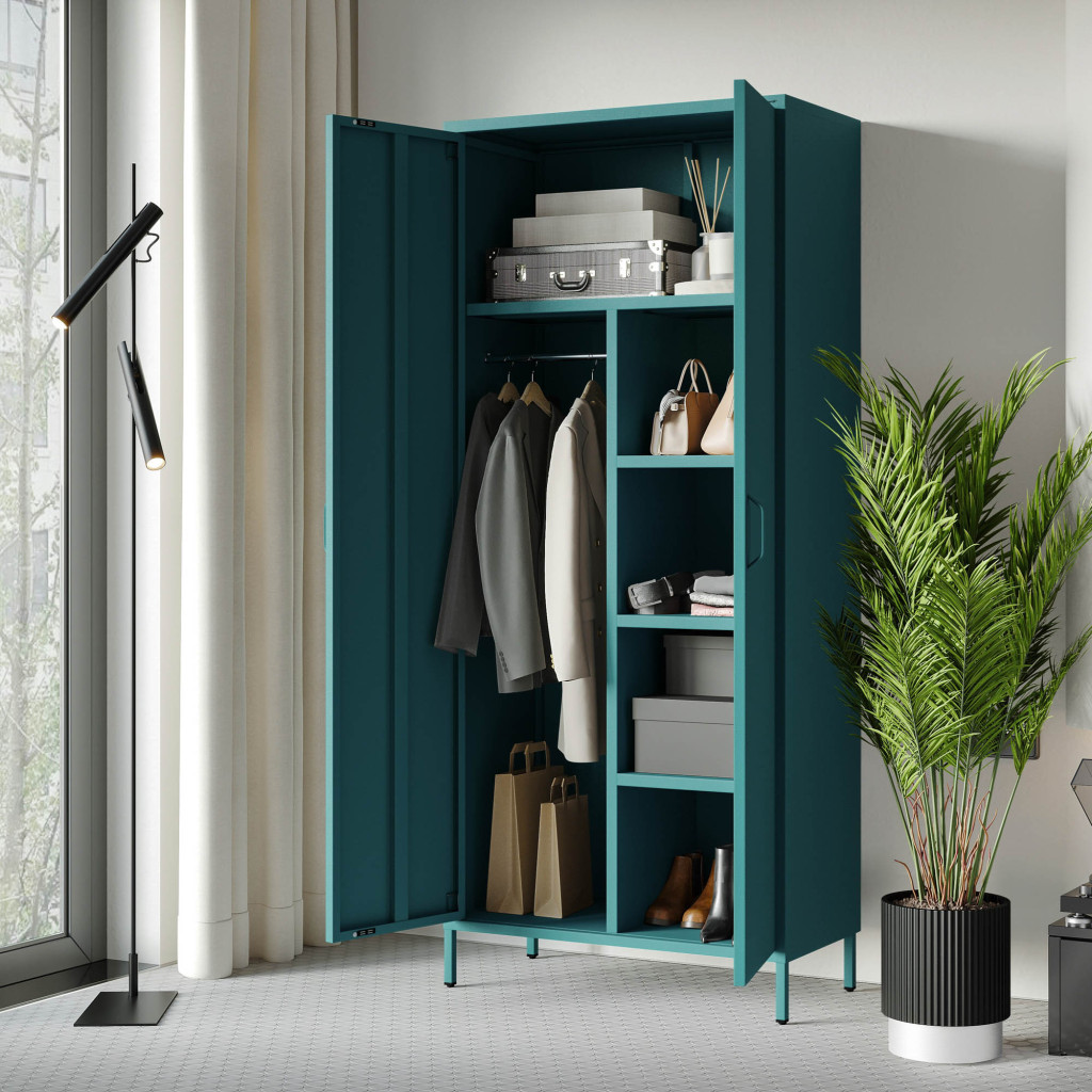A türkiz FLAVIO fém gardróbszekrény a modern enteriőrök igazi különc szépsége: egyszerre praktikus, magabiztos, és tele van olyan apró részlettel, amely miatt újra és újra ránézel. A Sparkling Brilliance™ bevonat különleges türkiz árnyalata fényben olyan finom csillogást hoz létre, mintha egy óceánfelszín mozdulna meg a szobában — ettől a bútor nem egyszerű tároló, hanem látványelem is, amely saját hangulatot teremt maga körül.