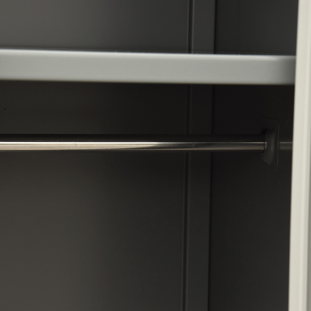 A belső kialakítás jól átgondolt és a mindennapi használatra optimalizált. A felső részben egy fix polc található, amely alkalmas kisebb tárgyak, dobozok vagy kiegészítők tárolására, alatta pedig ruhaakasztó rúd kapott helyet, amely lehetővé teszi a kabátok, munkaruhák vagy egyéb ruhadarabok gyűrődésmentes elhelyezését.