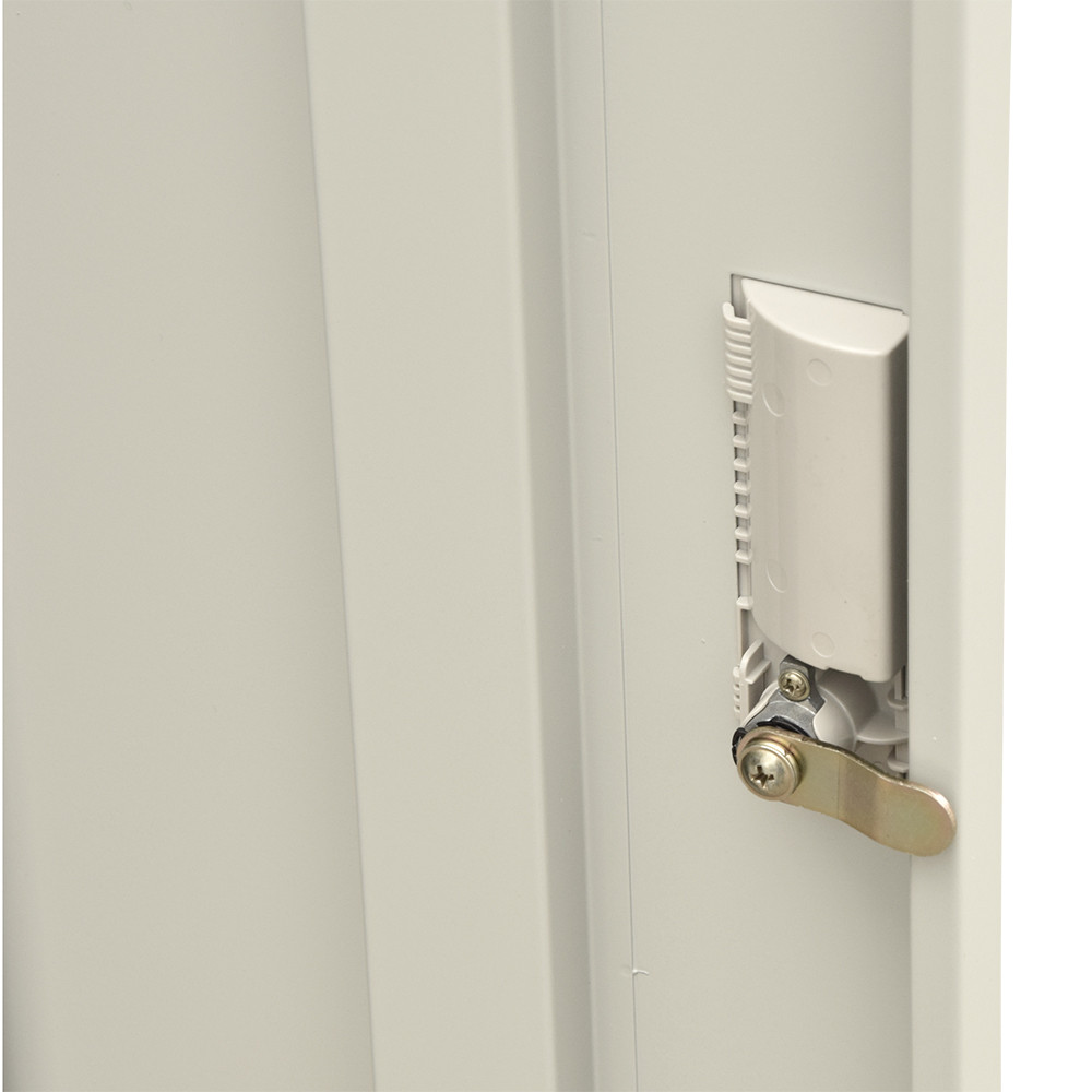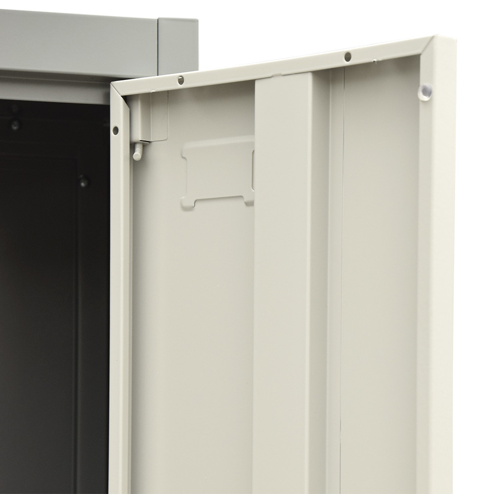 A szekrény kulcsos öltözőszekrény zárral van felszerelve, amelyhez 2 darab kulcs tartozik, így a benne tárolt személyes tárgyak biztonságosan elzárhatók. A világosszürke RAL 7035 szín visszafogott, letisztult megjelenést biztosít, ezért a modell könnyen illeszkedik különféle intézményi, ipari vagy irodai környezetbe.