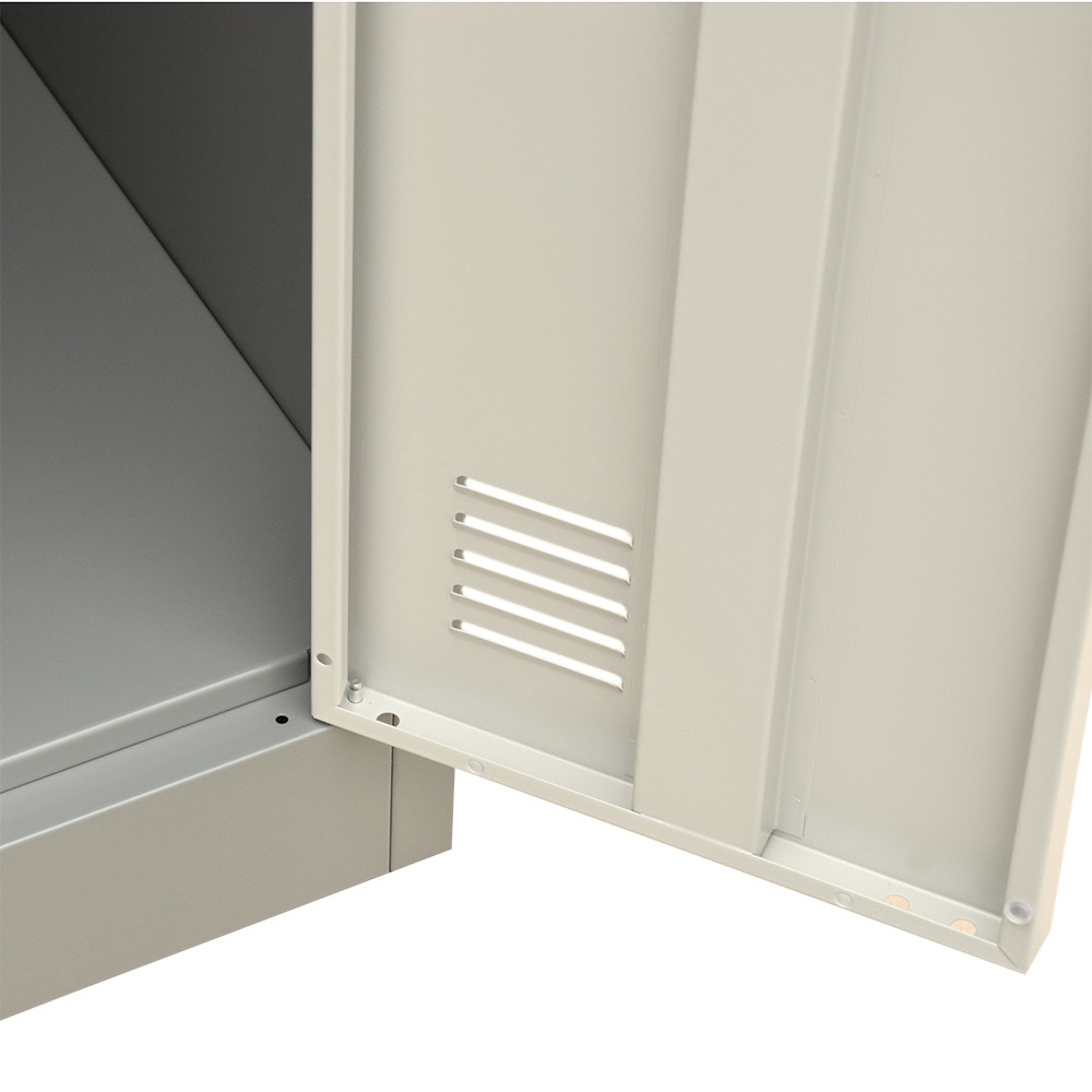 A 110 fokban nyitható ajtó jobboldali zsanérokkal készül, így kényelmes hozzáférést biztosít a belső térhez. Az ajtón elhelyezett szellőzőrács segíti a levegő áramlását, ami hozzájárul a szekrény higiénikus használatához, míg a névtáblatartó megkönnyíti az egyes rekeszek személyre szabott jelölését. Ez különösen hasznos munkahelyi öltözőkben, sportlétesítményekben, intézményekben vagy közösségi használatú helyiségekben.