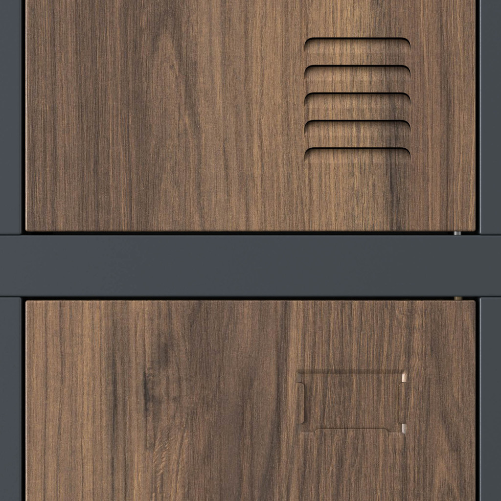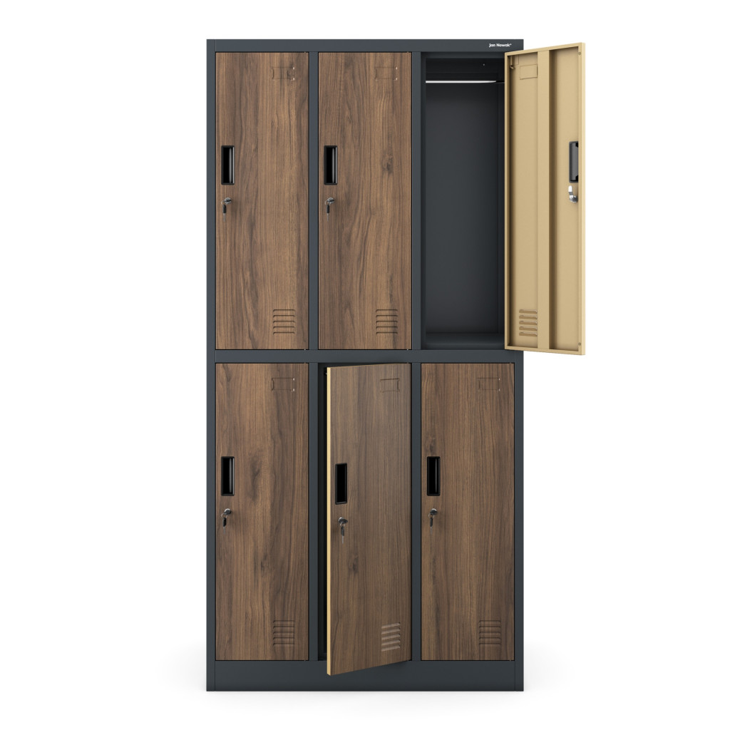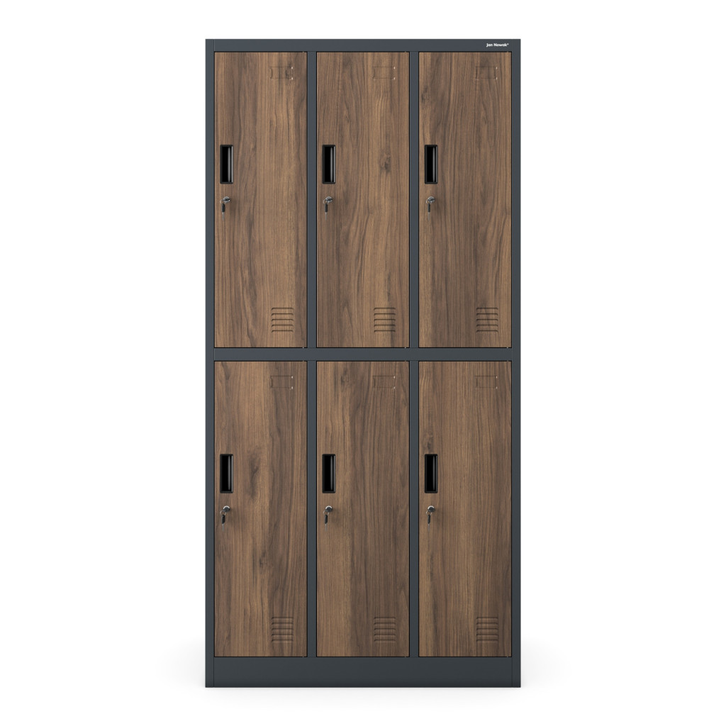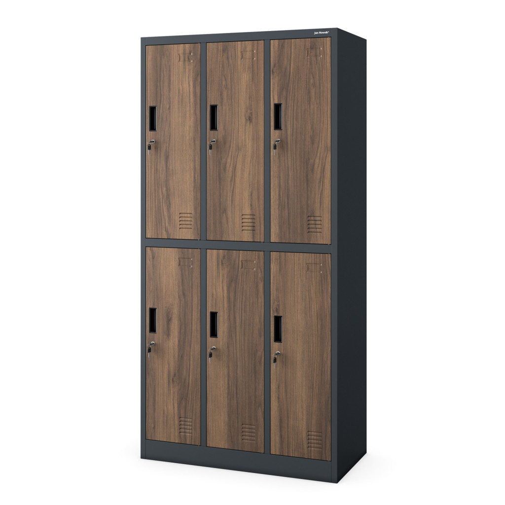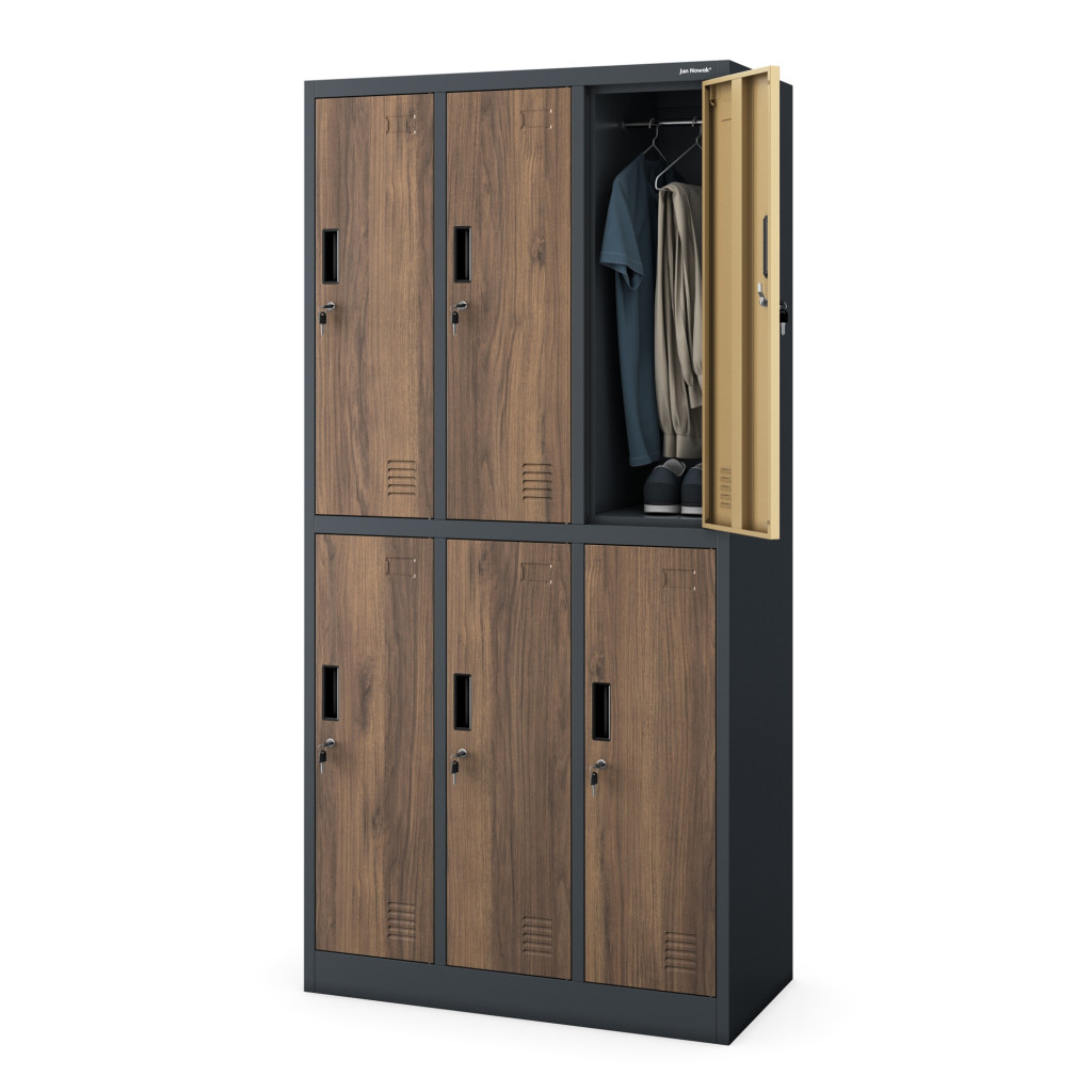 Az IGOR 1344 fém öltözőszekrény egyedülálló megjelenésével és praktikus kialakításával ideális választás szociális helyiségek, műhelyek, sportcsarnokok és iskolák számára. A szekrény antracit színű testtel és dió színű ajtókkal (RAL 7016) készült, amely elegáns és modern külsőt biztosít. Különlegessége, hogy stabil lábakon áll, így könnyebb a takarítás és higiénikusabb a használata. Az 6 különálló, kulccsal zárható rekesz lehetővé teszi több személy ruháinak és személyes tárgyainak biztonságos tárolását. A modell lapraszerelt kivitelben kerül szállításra, amely egyszerűen összeszerelhető a mellékelt útmutató segítségével.
