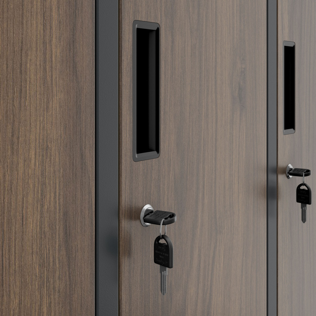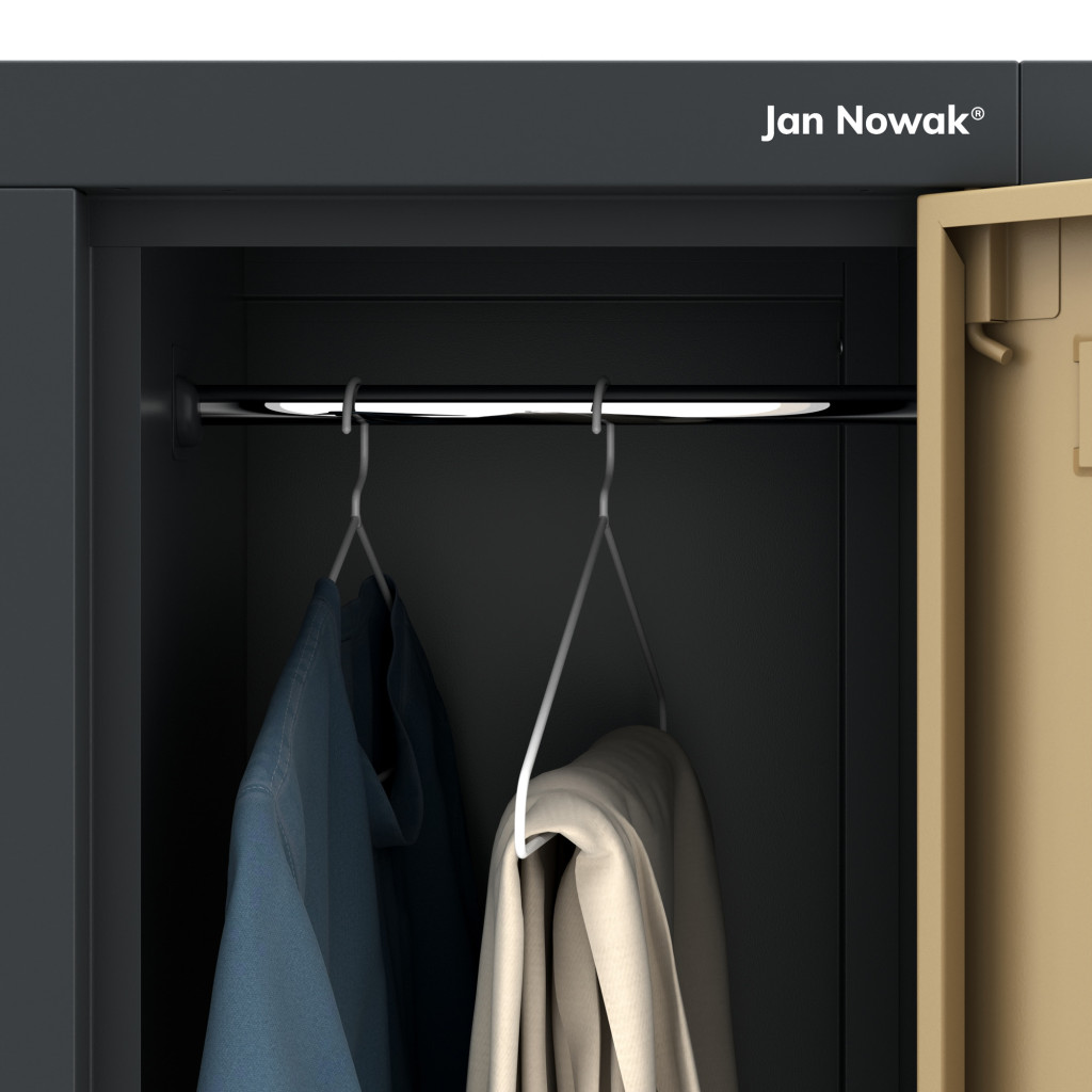 A rekeszek belső részében található fém rúd lehetővé teszi a ruhák gyűrődésmentes felakasztását, az ajtókon elhelyezett szellőzőnyílások biztosítják a megfelelő légáramlást, míg a névtartó helyek segítik a rend és szervezettség fenntartását. Minden rekesz elforduló zárral zárható, a készletben rekeszenként két kulcs található.