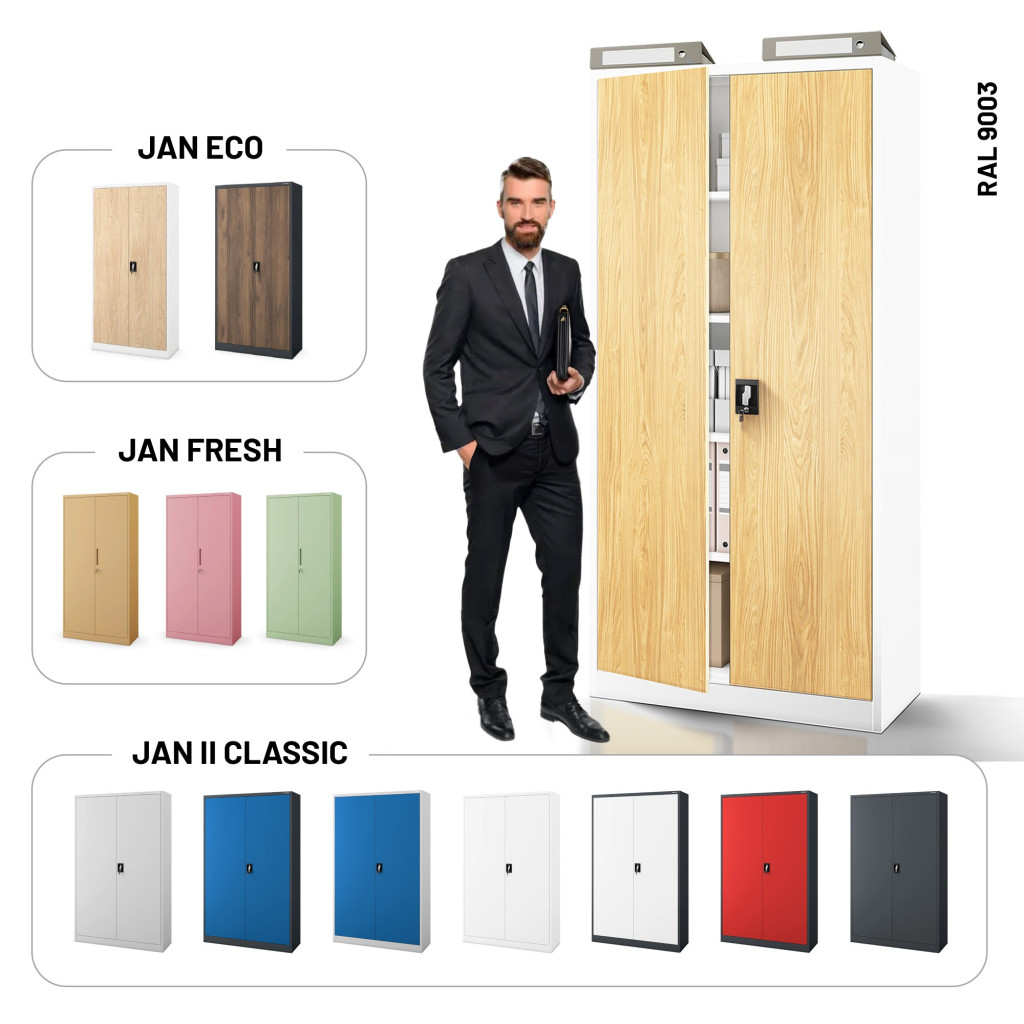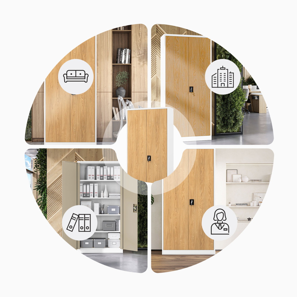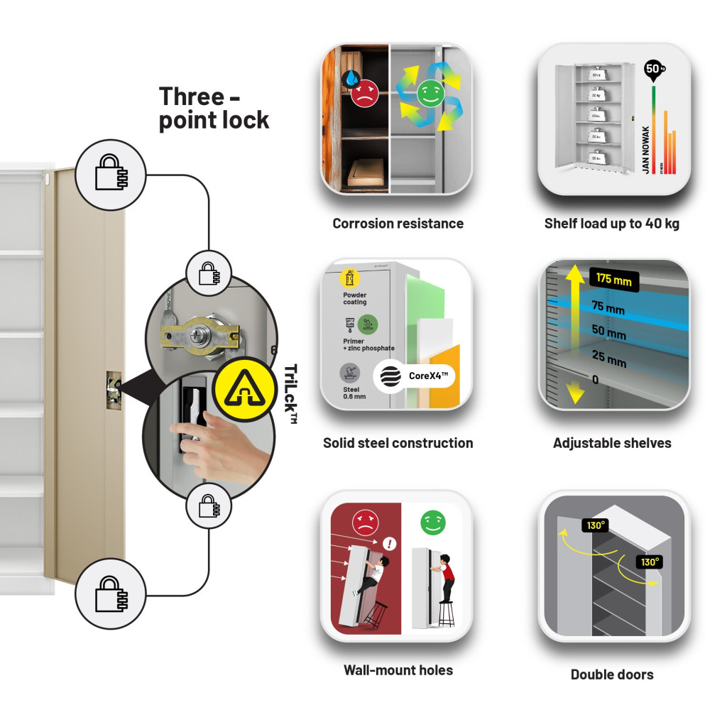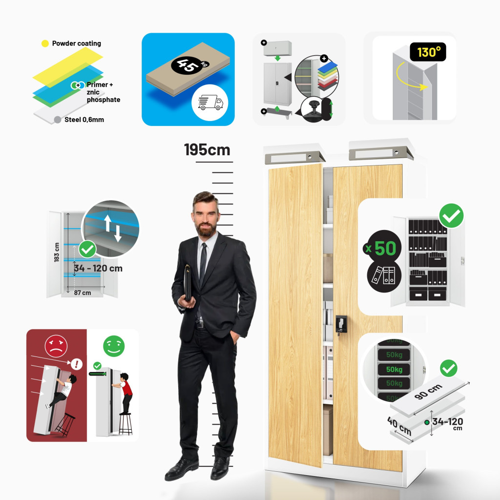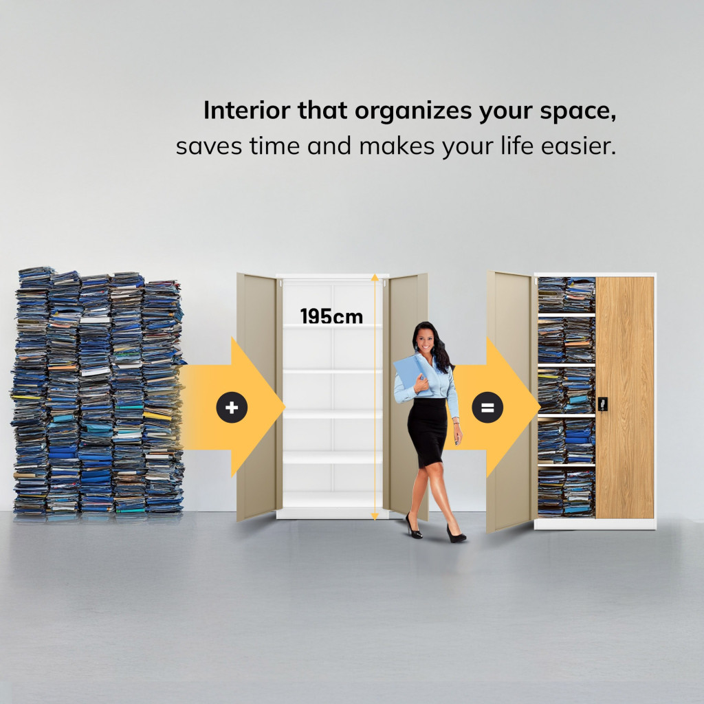 A stabil acélszerkezet hosszú távú használatra készült miközben a fehér és arany tölgy fa hatású felület modern és barátságos megjelenést ad a térnek A belső kialakítás lehetővé teszi akár ötven iratgyűjtő elhelyezését így egyetlen szekrény elegendő a teljes dokumentáció rendezésére