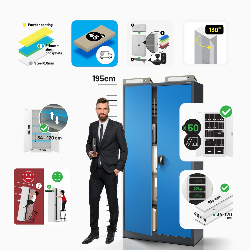 A 195 cm magas, 90 cm széles és 40 cm mély méretek ideálisak akár 50 lefűzős mappa tárolására,